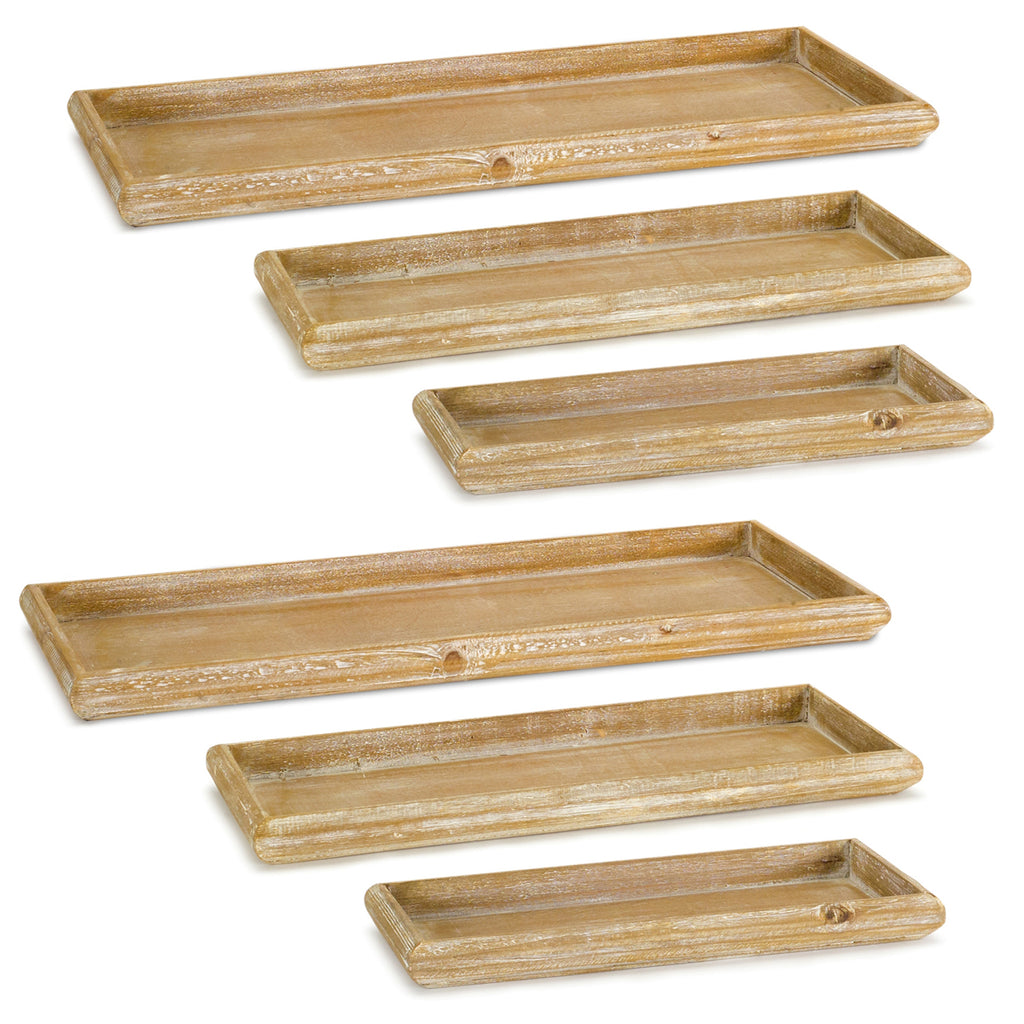 Enhance the effect of your home decor with this stunning set of Wooden Decorative Trays. Featuring three assorted sizes and six total pieces, the natural wooden composition paired with the white-washed finish makes it a great addition to any style of decor. Use this set to display your accent centerpiece decor, LED candles, or faux floral arrangement.