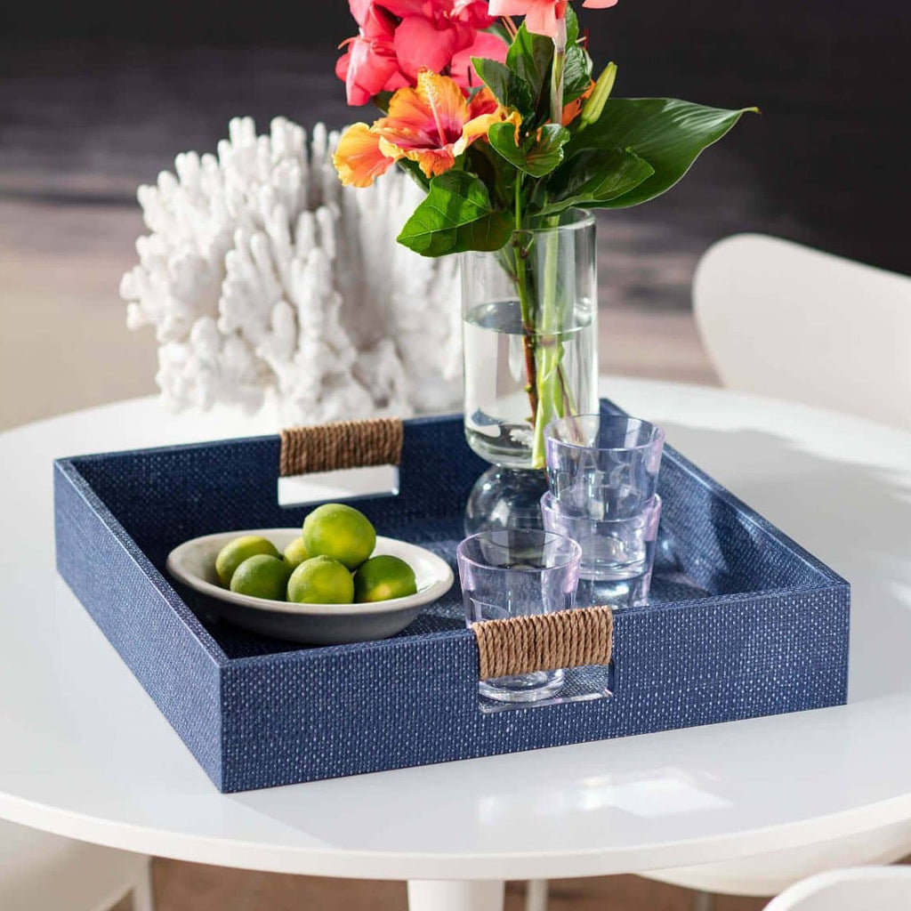 Entertain with coastal charm. Perfect as a functional accessories or to display decorative items, our Logia trays are a textural marvel for the eyes and fingers. Rope wrapped handles accent our unique resin rattan creating a perfect place to display artful objects or enjoy a glass of ice tea.