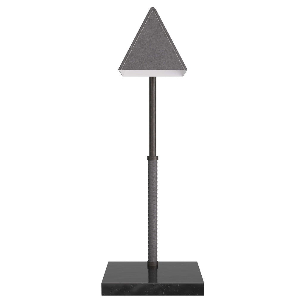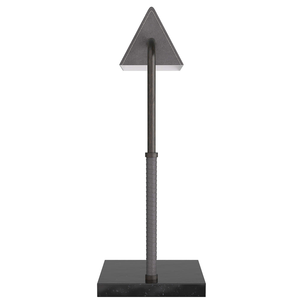 Arteriors Home lighting embodies the perfect balance of form and function, creating an ambiance that is both captivating and inviting. Crafted with meticulous craftsmanship, Arteriors Home desk lamps seamlessly merge modernity and timeless appeal, enhancing both the ambiance and functionality of any workspace. Our pharmacy-style Arteriors Tyson table lamp makes a handsome addition in any library or living space. The task lamp is crafted with a pivoting, triangular shade that is clad in charcoal leather and lined in a white lacquer finish. Leather is featured again, tightly wrapping the antique brass steel post and the rectangular base, creating texture and visual interest. A slice of charcoal marble forms the lamp’s rectangular bronze-finished base. Finish will vary.