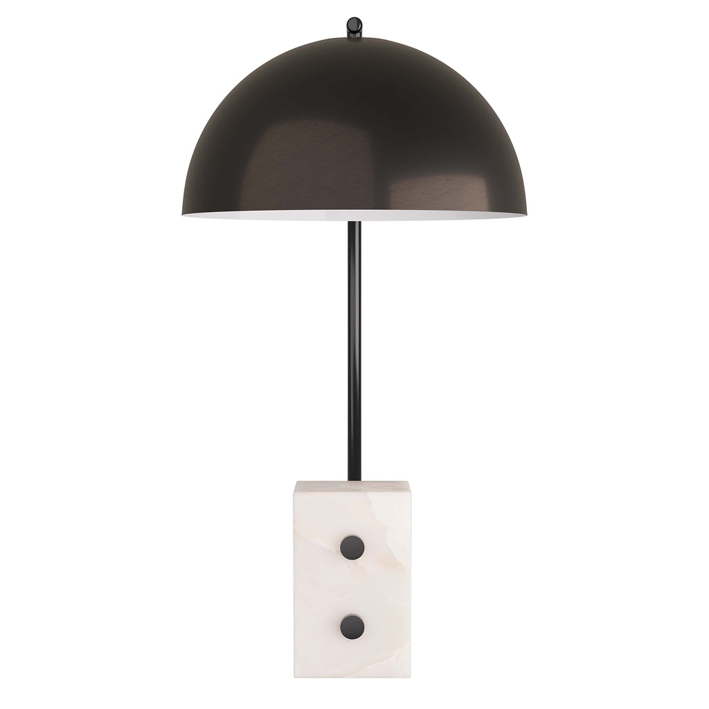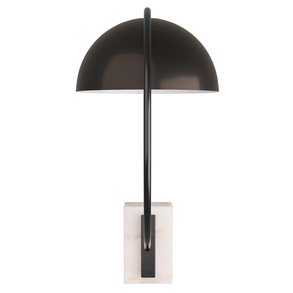 Arteriors Home lighting embodies the perfect balance of form and function, creating an ambiance that is both captivating and inviting. Crafted with meticulous craftsmanship, Arteriors Home desk lamps seamlessly merge modernity and timeless appeal, enhancing both the ambiance and functionality of any workspace. Introducing the Arteriors Weslan lamp, a pharmacy-style lamp with old-meets-new vibes. The task lamp features a domed, english bronze-finished steel metal lamp shade lined in white lacquer. A c-shaped arm connects the lamp to a geometric white alabaster base. Finish may vary.