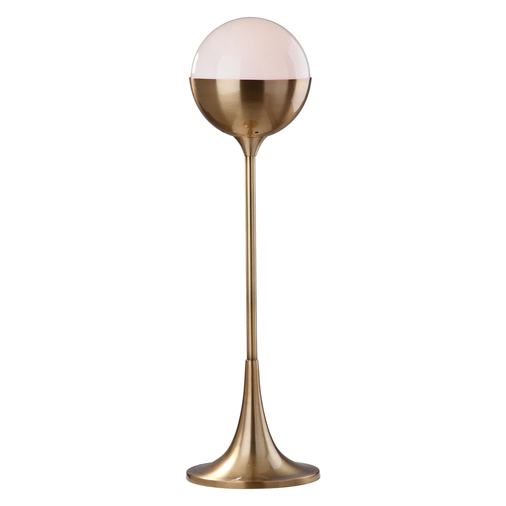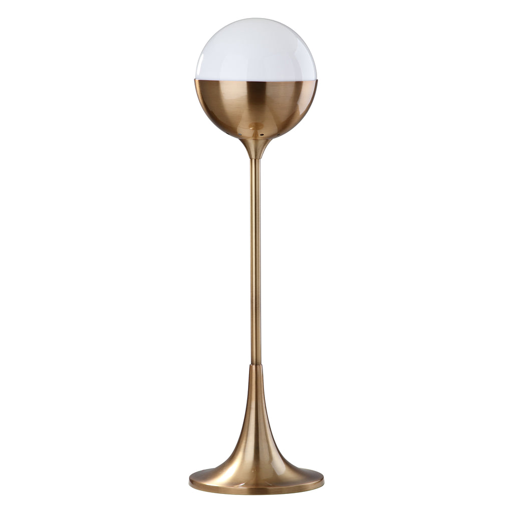 Embrace midcentury style with this 27-inch table lamp. A modern update of a vintage treasure, its bold brass and gold finish is paired with a white globe shade for soft illumination. Designers use it in pairs to frame a living room sofa, sideboard or console.