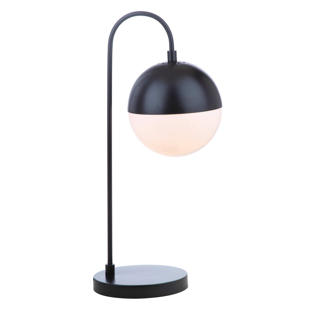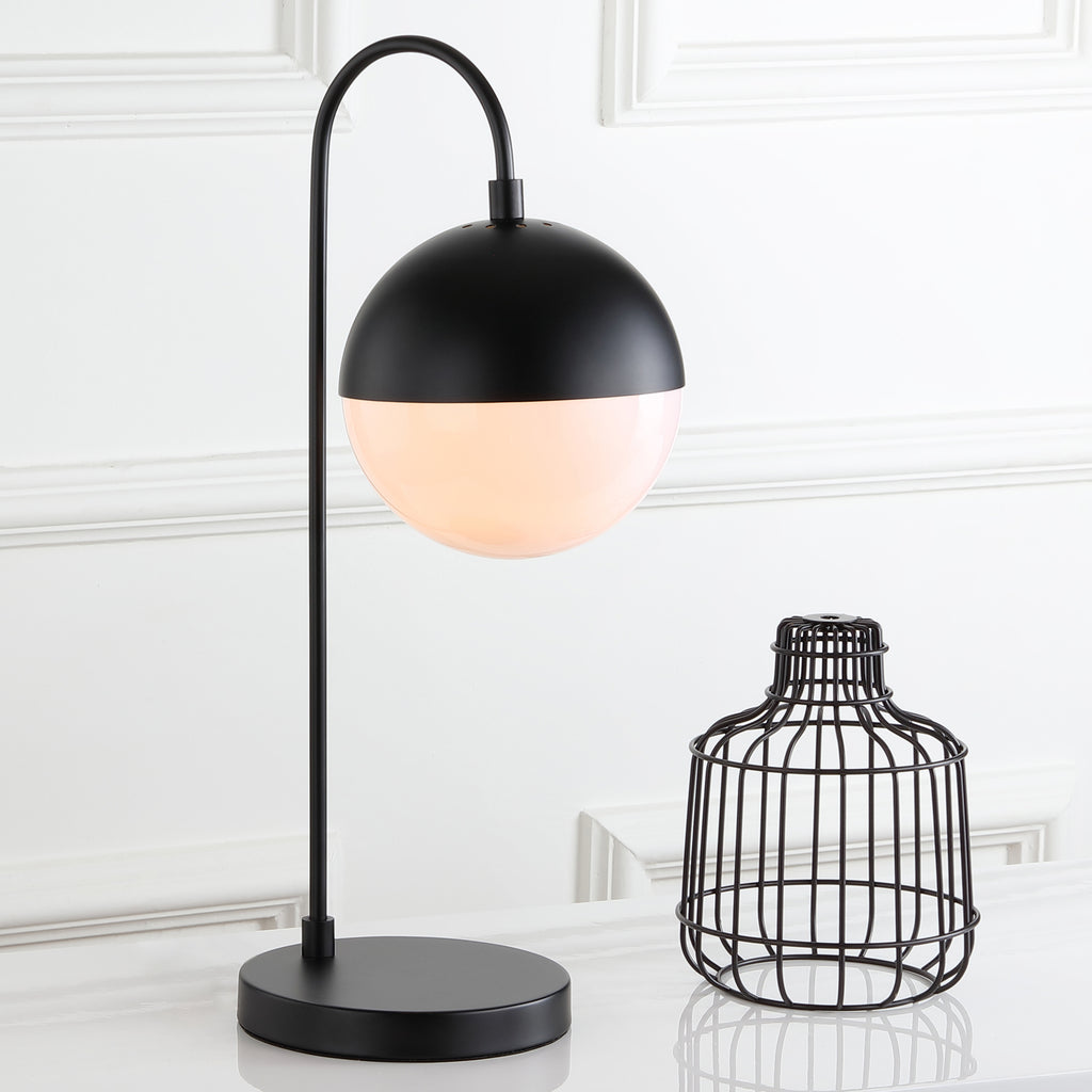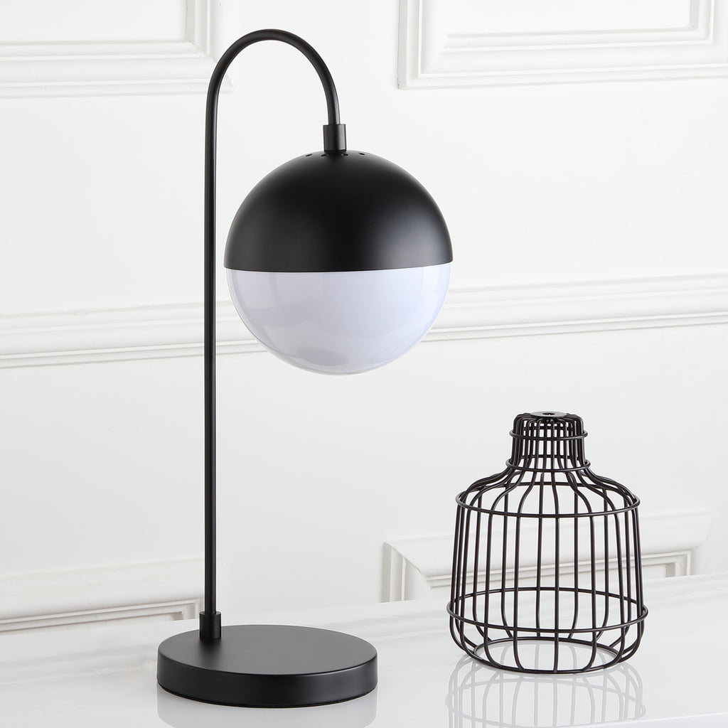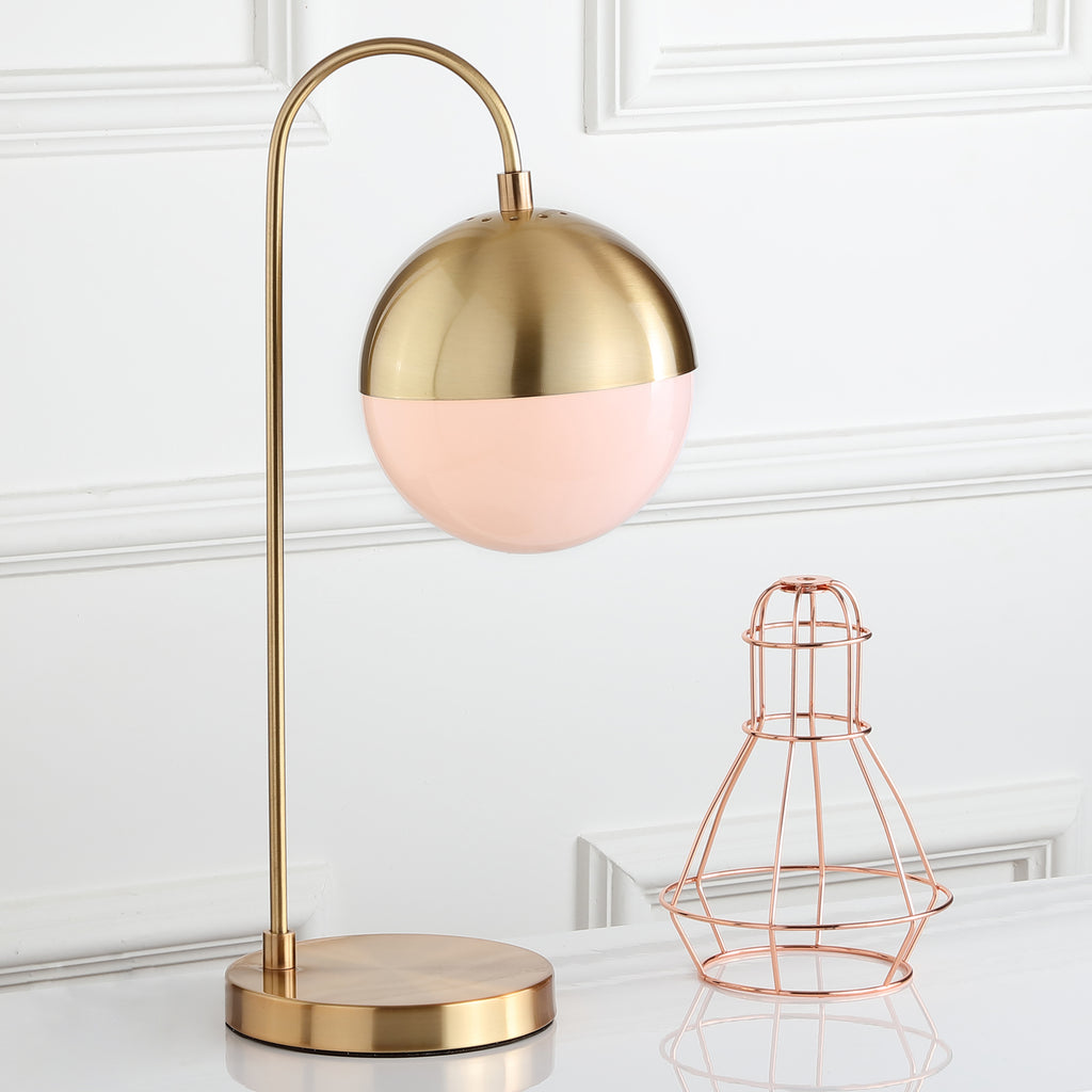 Inspired by edgy mid-century modern style, this contemporary Nori Desk Lamp steals the show in any living room. Designed with a luxurious modern brass and gold finish, it diffuses light from a partially white retro globe shade to create a warm glow.
