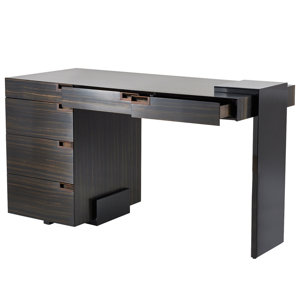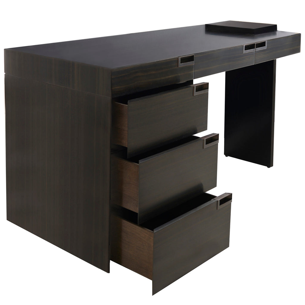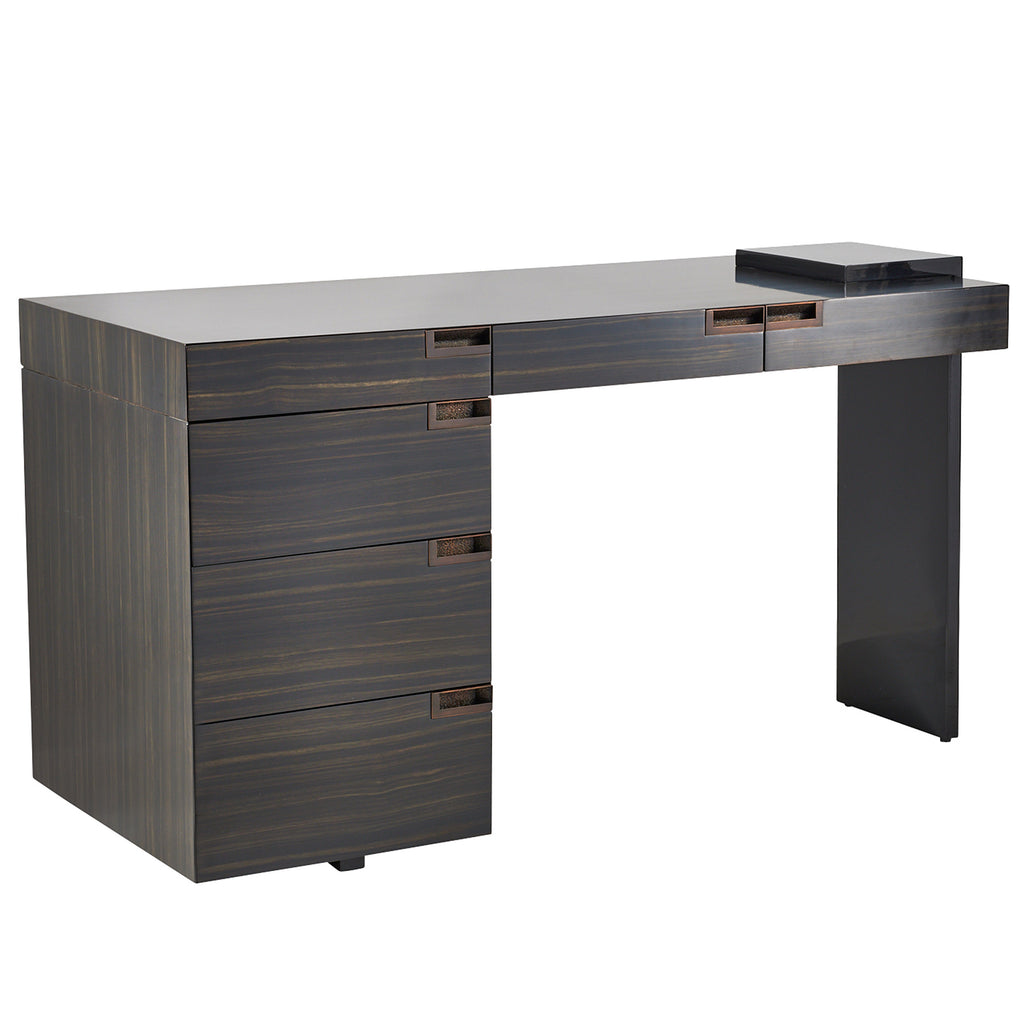 An executive classic updated for the contemporary era, the Arteriors Carmichael is constructed on a smaller scale for adaptability. Charcoal amara veneer accented with black high-gloss lacquer that lends a masculine appeal. Featuring four inset side drawers and two at top, each is lined in a charcoal oak veneer and constructed for a soft close, finished with bronze brass pulls. Finish will vary.