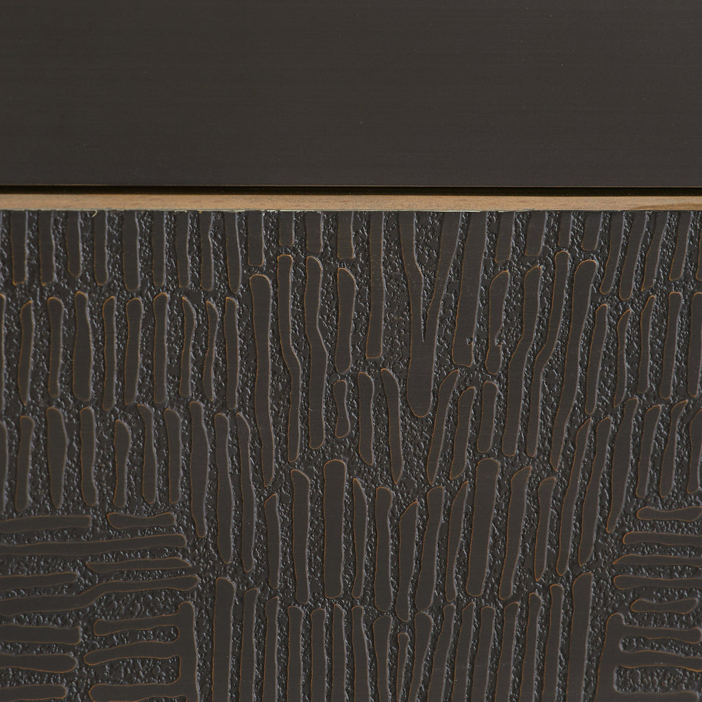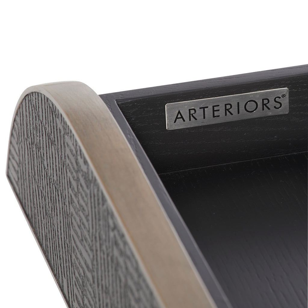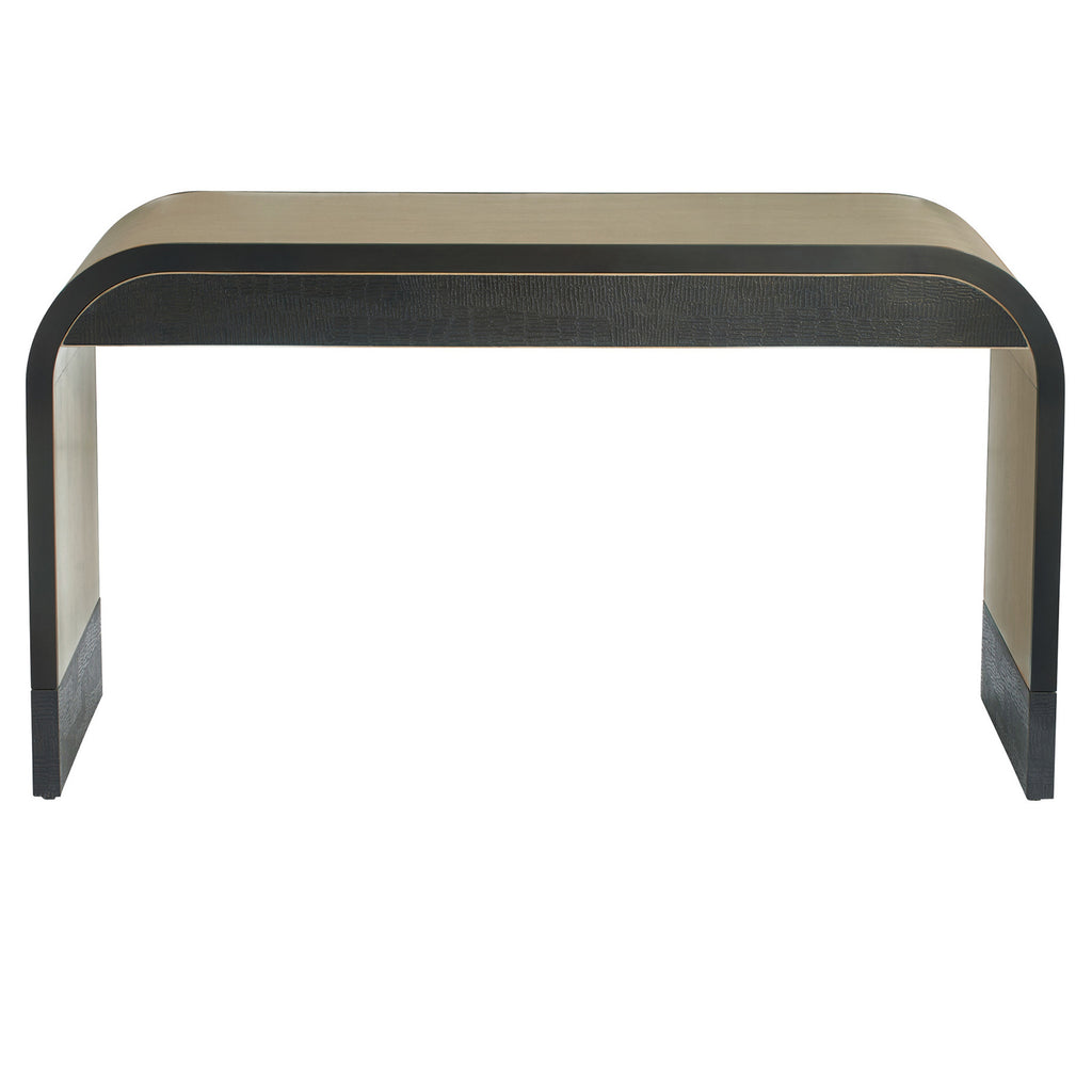 Art Deco-inspired, this waterfall desk of chamois gray eucalyptus veneer offers the ideal textural accent to any office space. Soft-close drawers with bronze textured brass are outlined in antique brass and constructed from ebony oak veneer; finish will vary.
