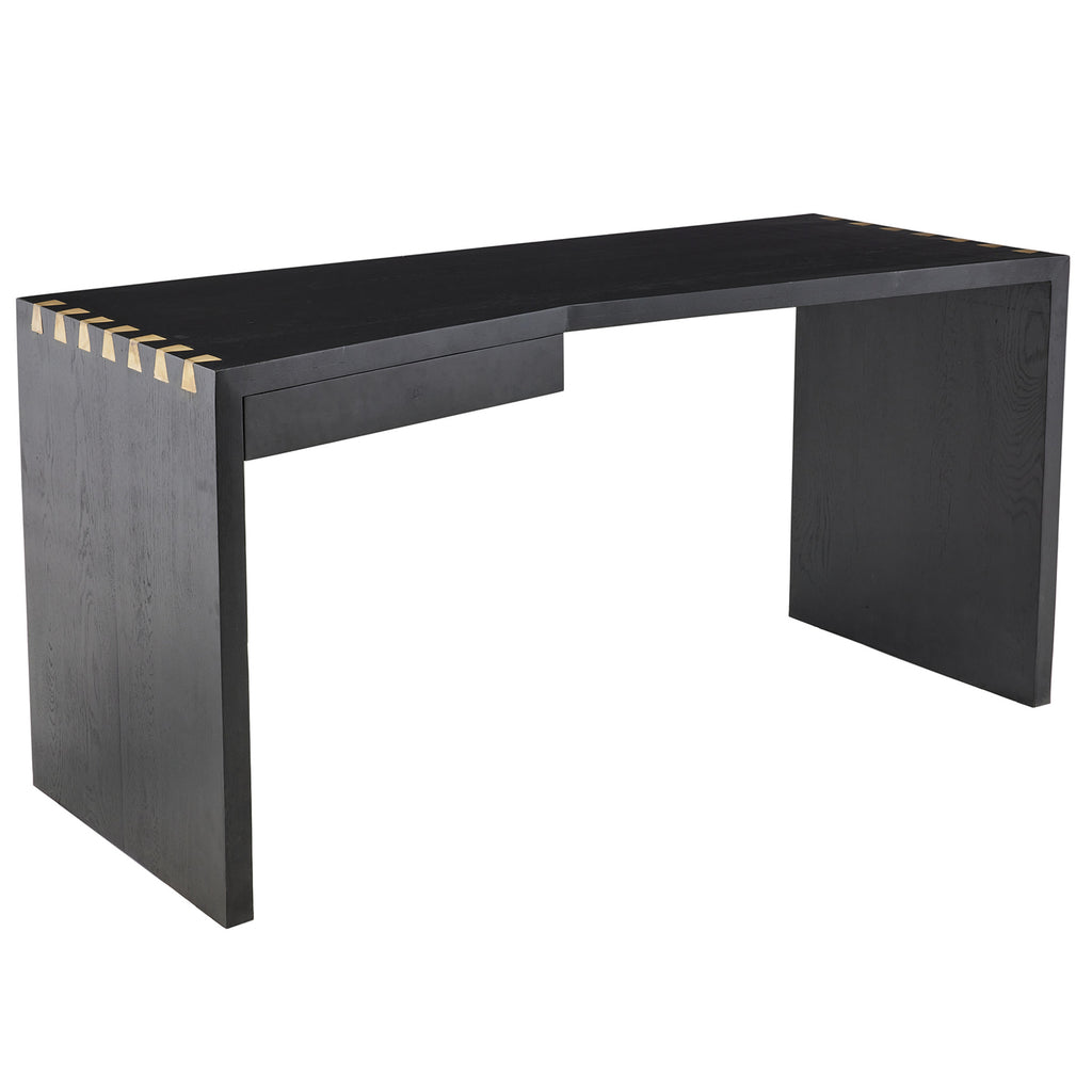 The craftsmanship of classic dovetail joinery inspired this modern desk of ebony finished solid oak. Constructed with bold inlaid antique brass joints at the side edges, it was designed to float seamlessly in any room. A single drawer is adorned with an antique brass accent.