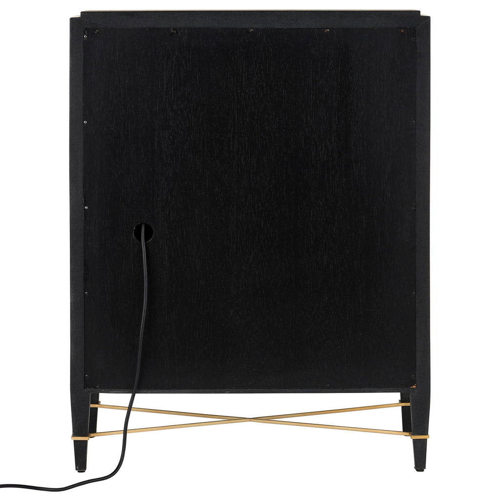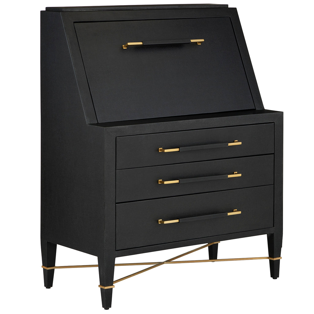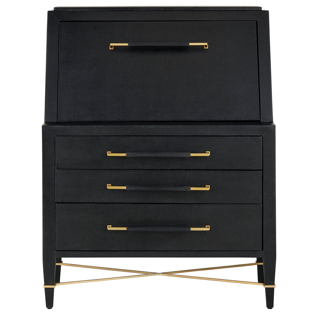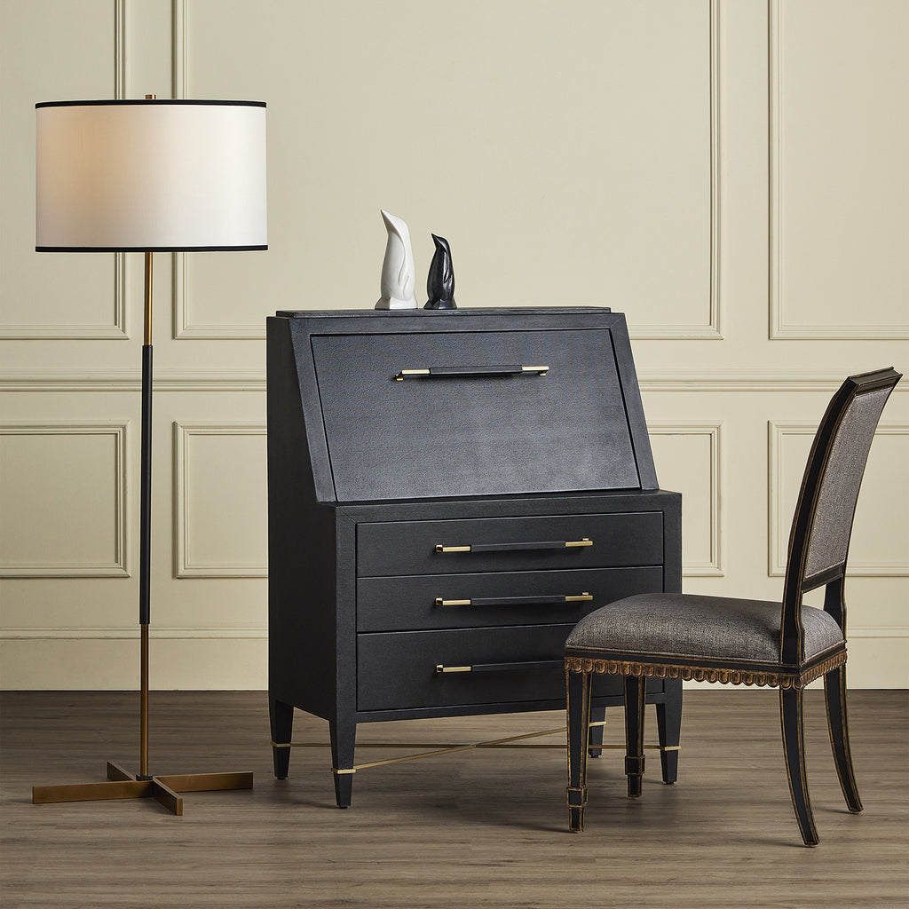 The Currey & Co Verona Secretary Desk is darkly handsome covered in black lacquered linen with metal detailing in a champagne finish. The stretchers on this black desk create added interest to enhance its flair. The beautifully detailed drawer pulls, which are wrapped in matching material in the middle and left bare on each end, grace each drawer with their metallic sheen. The top folds down on this classic piece to reveal a desktop, a center-adjustable shelf, two fixed shelves, built-in power outlets, and two USB ports. Aimee Kurzner designed the chic piece that also has three large drawers.