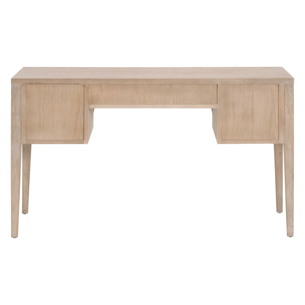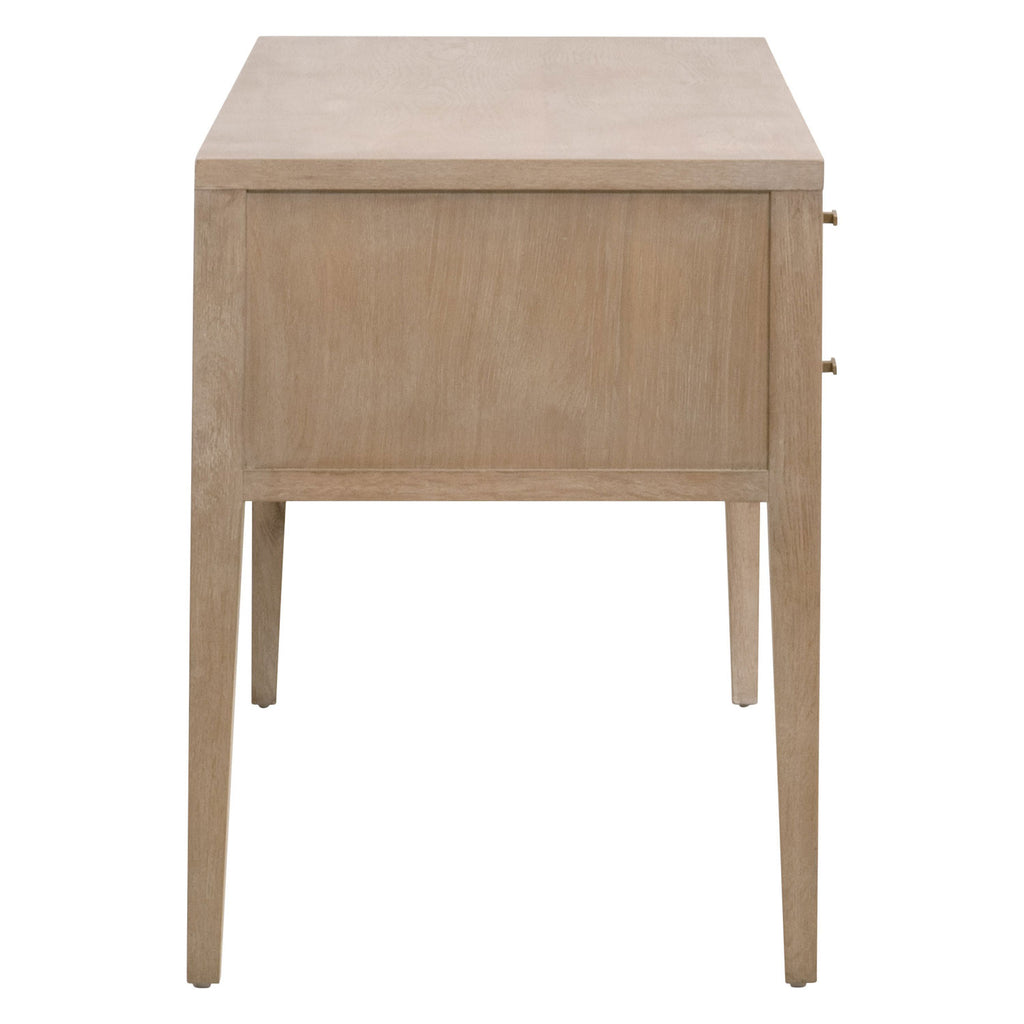 The bohemian-style Essentials for Living Cane writing desk with rustic charm. It features muted smoke gray tones and a natural appearance. Constructed with oak wood, the overall aesthetic of this desk is coastal and earthy. The drawers have a beautiful front-facing cane inlay, creating a very tropical and bohemian vibe. Conveniently, the desk contains plentiful storage space for pens, notepads, chargers and other small office supplies with its five storage drawers. The back of the desk is finished so it could be free-standing, if desired. This remarkable writing desk will be a grand addition to any home office, living room or bedroom. Bella Antique Collection products are made with natural stone, antiqued metal, concrete, and reclaimed wood. These products include unavoidable variation in color, texture, uneven grain, blemishes, scratches, marks, and cracks. These features are not defects, but rather the material's natural characteristics.