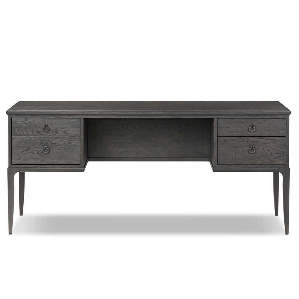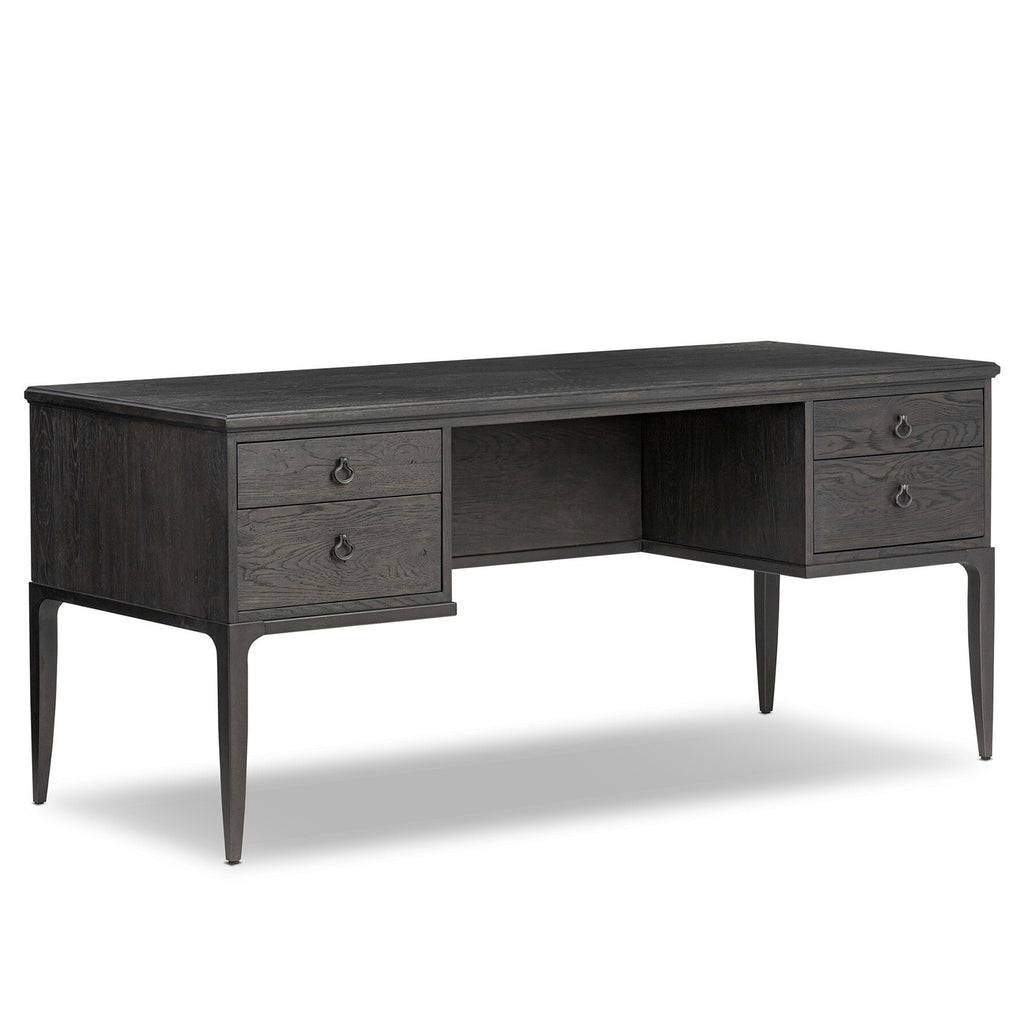 Baroque-period detailing gives this oak desk its classic look. Made from worn black oak with metal ring pulls on its four drawers, as well as cabriole-like legs to soften the lines.