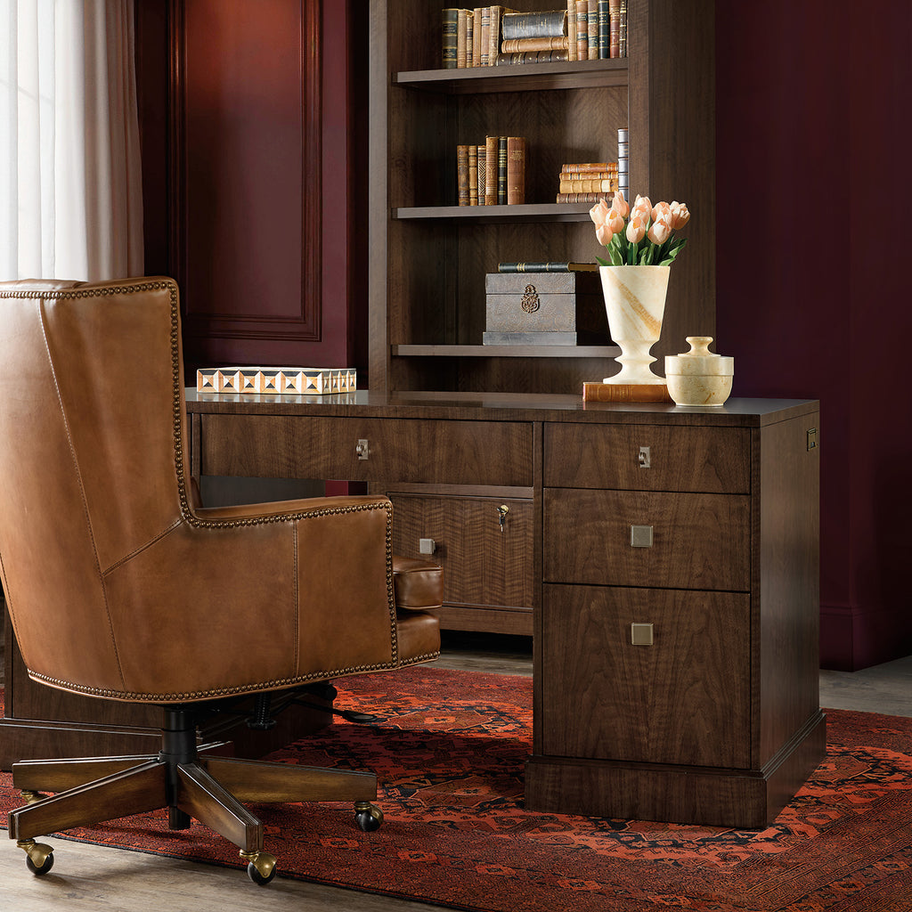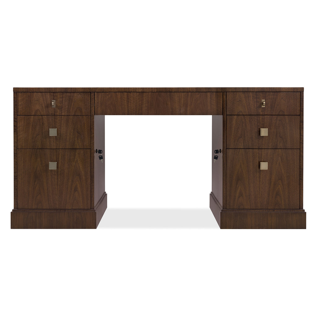 Command your workspace with the Archives Executive Desk, designed for structured elegance. Crafted with figured walnut veneers, it includes seven versatile drawers, integrated file storage, and smart wire management. The satin brass hardware and rich walnut finish speak to a "hipstoric" aesthetic. Archives taps in to a design trend that mixes modern, trendy styles with historic elements, known as "hipstoric". Complementing a variety of design styles with timeless forms and elements, the trend creates a sense of undeniable luxury. Layering rich and authentic materials, such as figured walnut veneers, top grain leather, woven raffia, and polished marble, Archives’ assortment speaks to consumers who yearn for structured elegance with a dash of mystery.