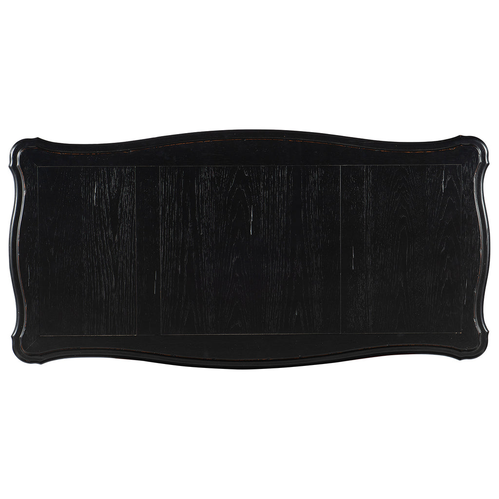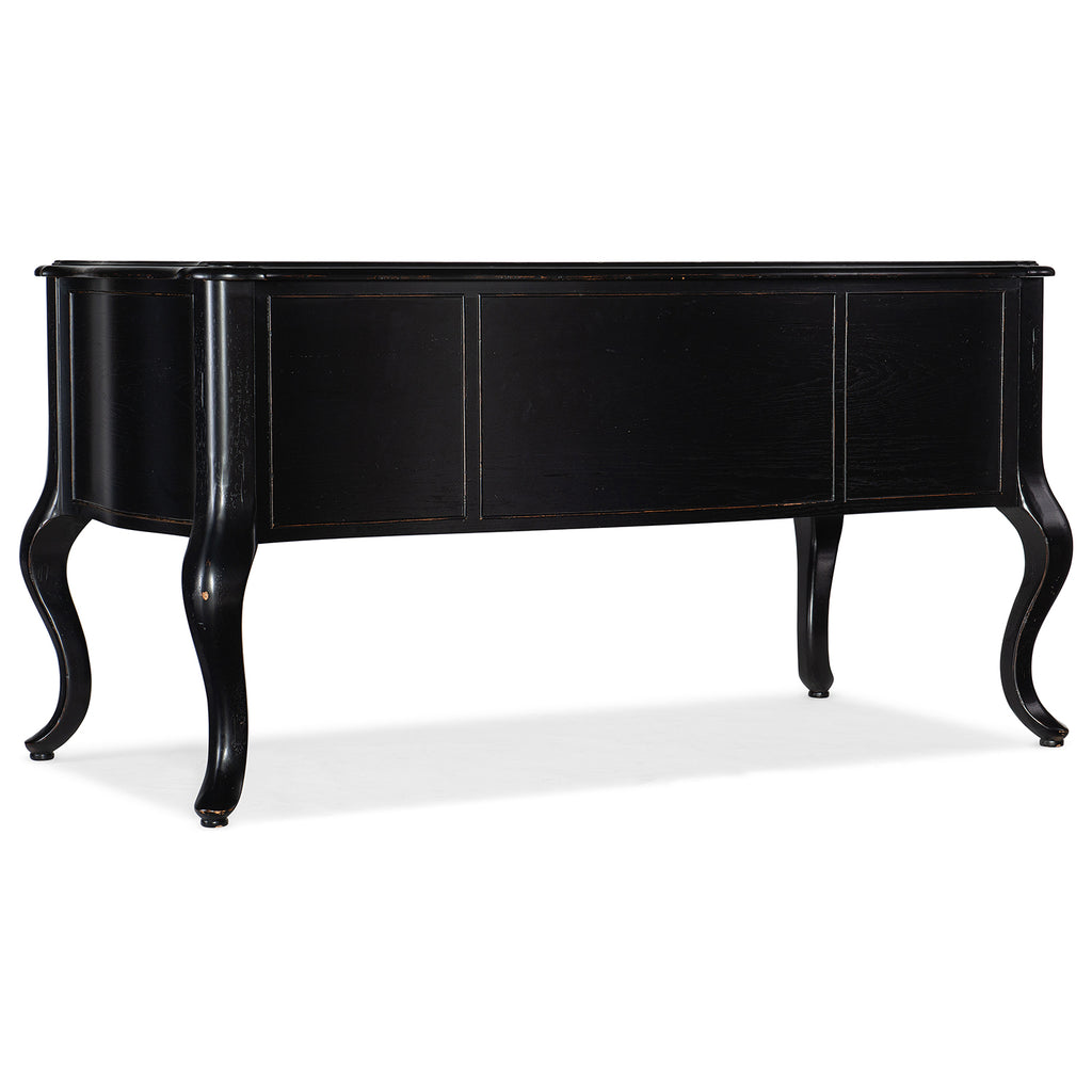 Casual yet refined and stylish, the Bristowe Executive Desk sets a professional and inviting tone for any work-from-home space. The dramatic desk silhouette is crafted of Pecan Veneers in a Tuxedo black paint finish with touches of warm brown, and is accentuated by oil-rubbed bronze-finished rings and pull hardware and boldly-shaped cabriole legs. The desk offers 4 drawers, with the left drawer a file drawer with pendaflex system and full extension metal ball bearing slides and the top right drawer featuring a removable pencil tray, inserts and removable writing slide with full extension metal ball bearing slides. The center drawer has a drop-front for keyboard use and a wire cutout in the back of the drawer. The right bottom drawer has a false bottom with finger hold for hidden storage and is on full extension metal ball bearing slides. The desk is finished on all sides so it can float in a room.