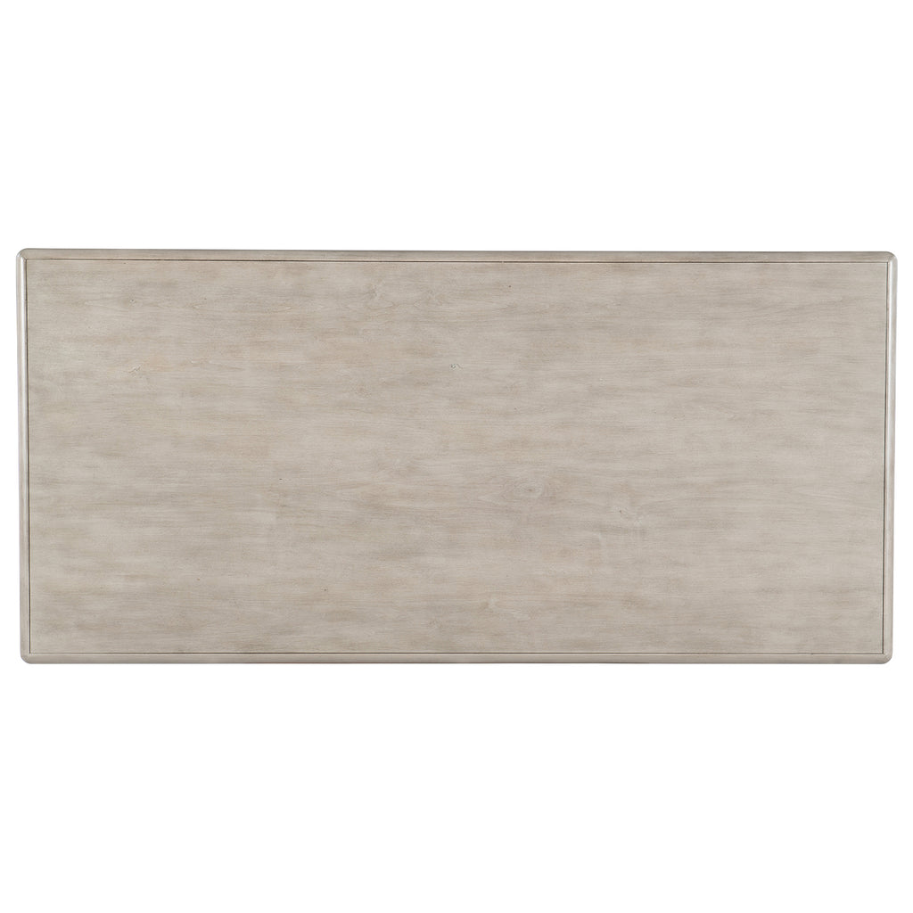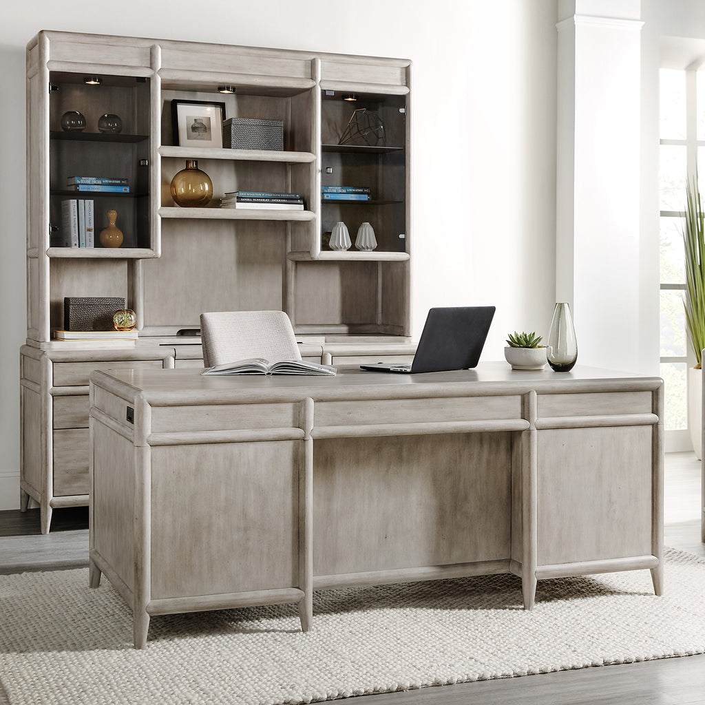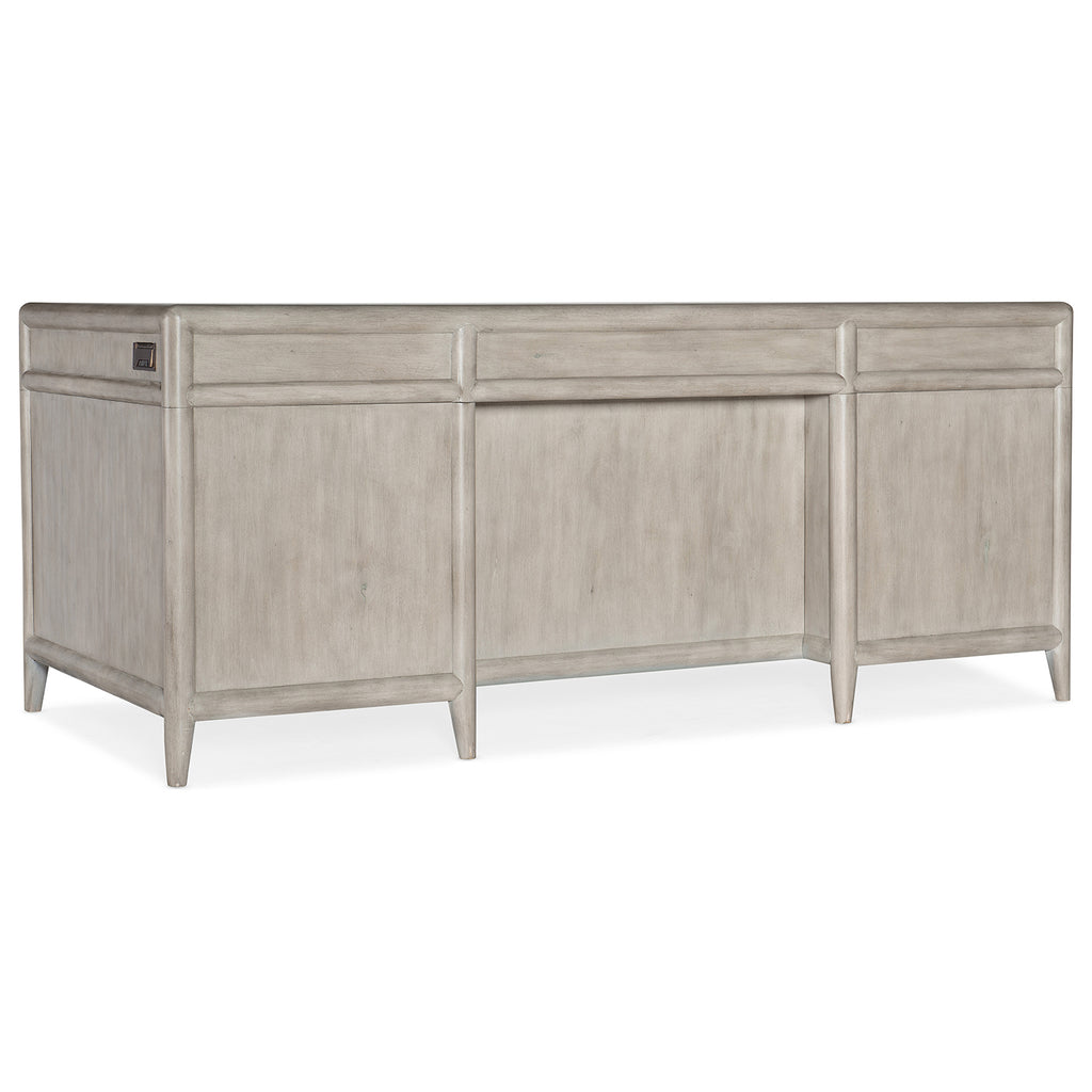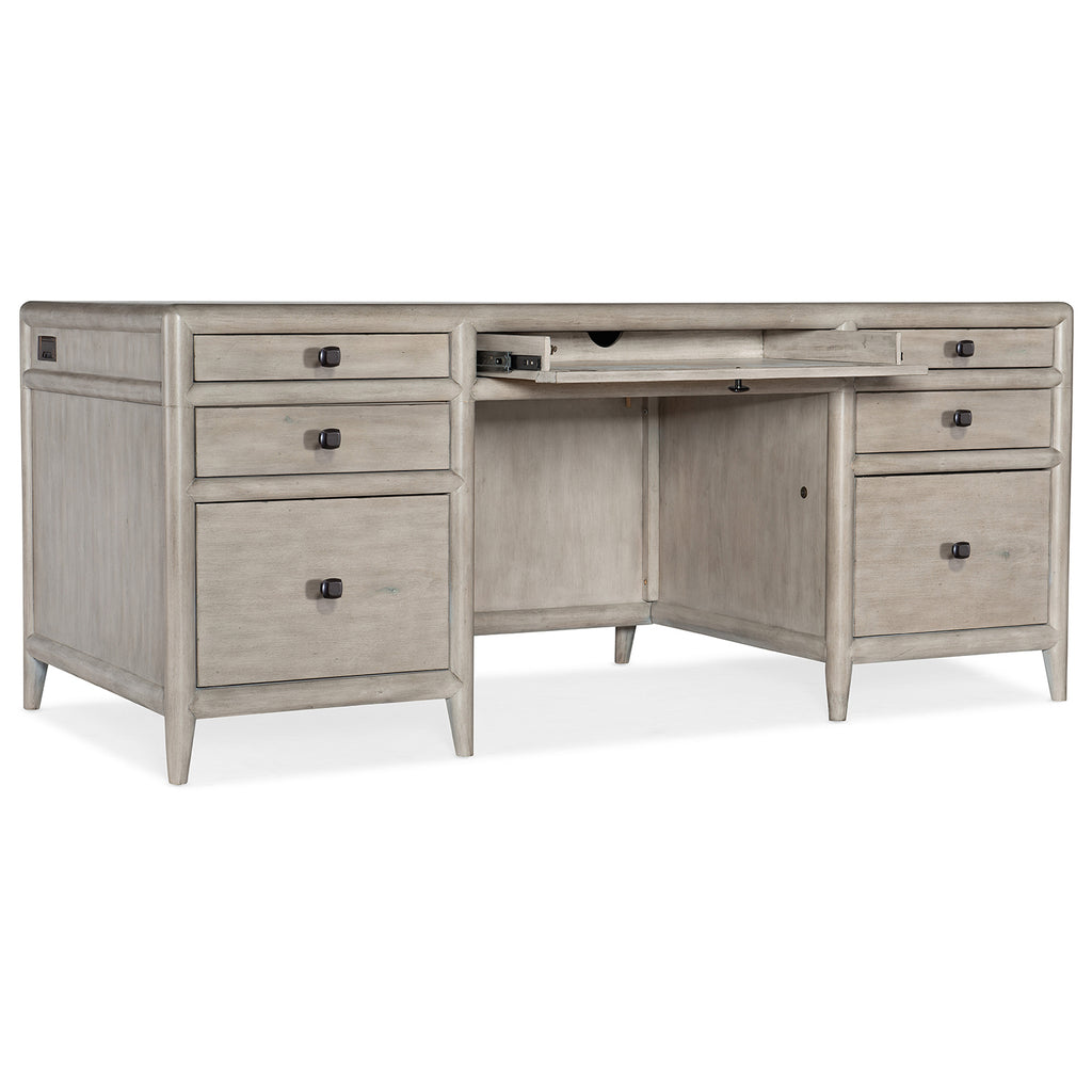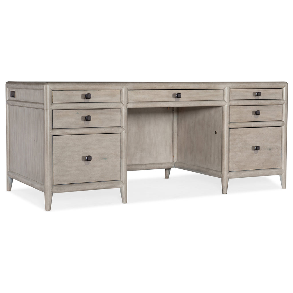 With a soft modern and casual appeal, the Burnham Writing Desk is crafted of Alder Veneers with knots in a Gray Mink finish accented by dark bronze knob hardware. Featuring 7 drawers, the top left and right drawers are on full extension metal ball bearing slides with removable divider inserts, one removable writing slide and one removable pencil drop-in that can be used on either side. The bottom drawers are locking file drawers with a pendaflex filing system and full extension metal ball bearing slides. The center drawer has a drop front for keyboard use. Finished on all sides so the desk can float in a room.