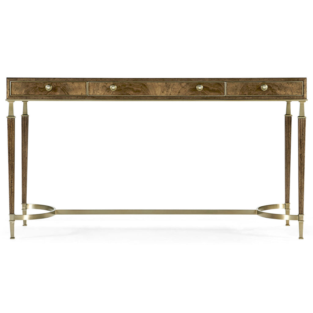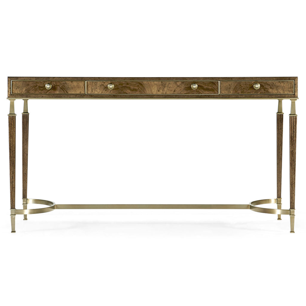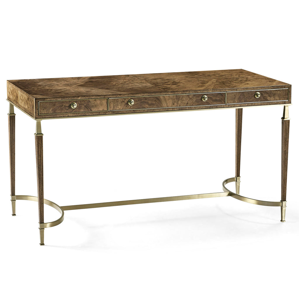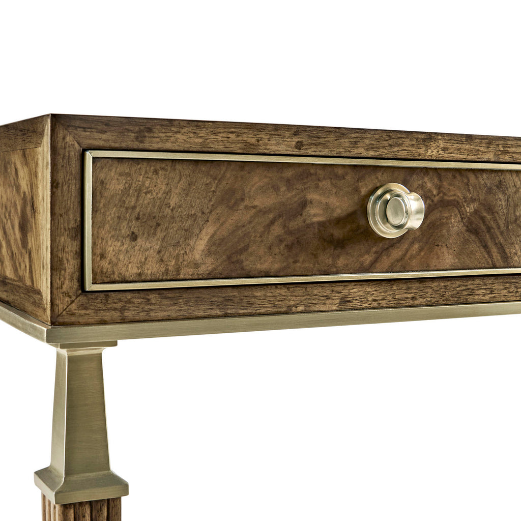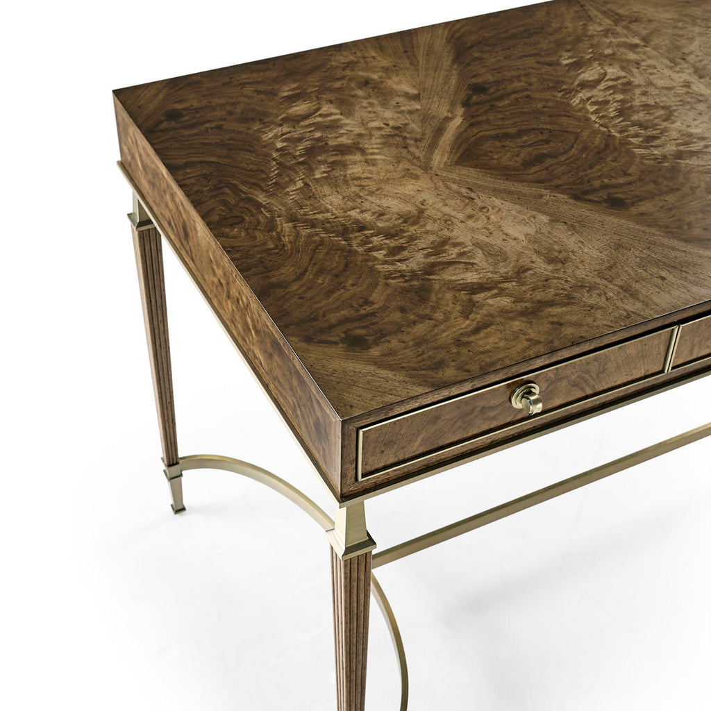 Inspired by classic Spanish forms, the top features walnut swirl in a traditional book match. Hardware is cast in our foundry and finished in a light champagne patina.