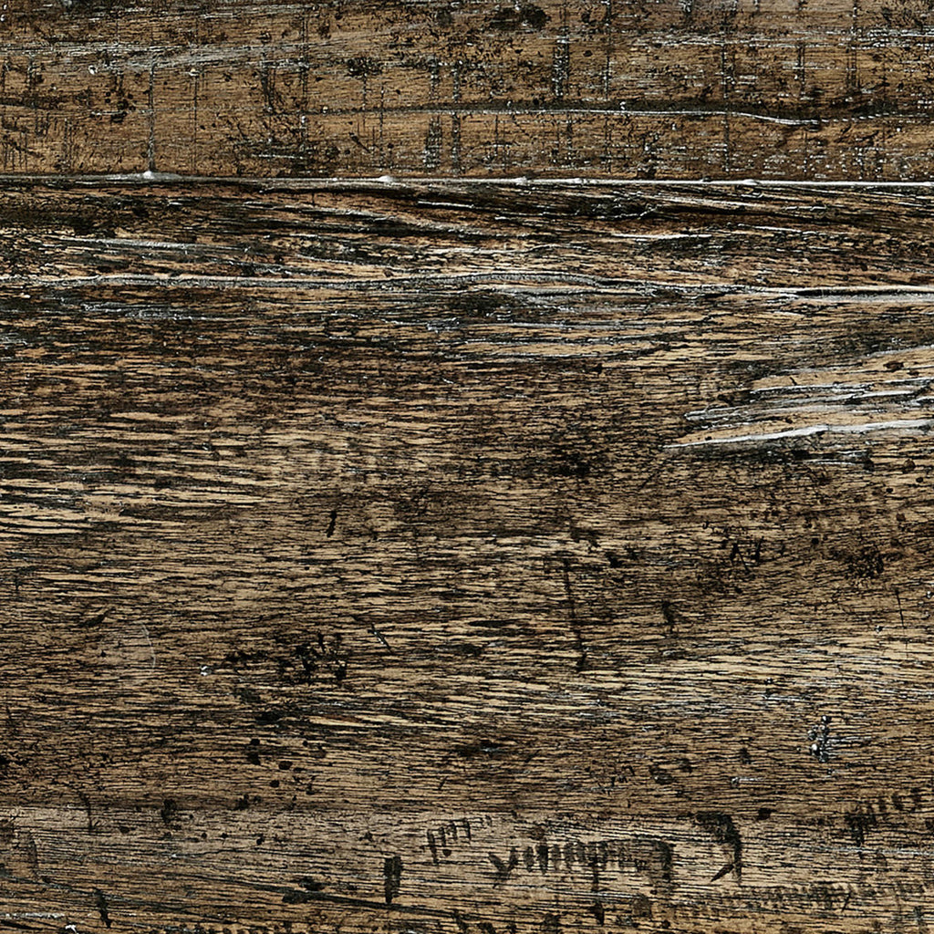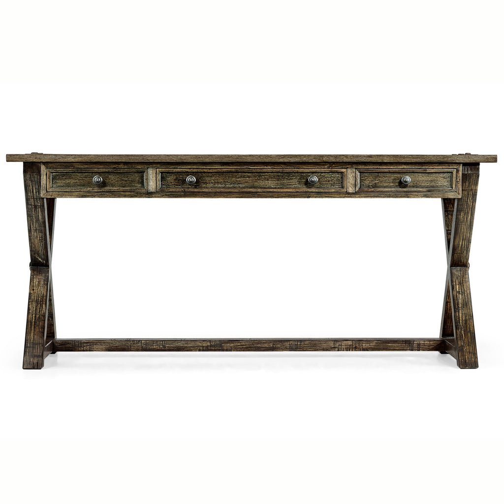 Rectangular solid dark driftwood desk with a rustic finish revealing exposed saw marks. Three small oak lined drawers to front. Mortice and tenon joints to X-frame support and top surface.
