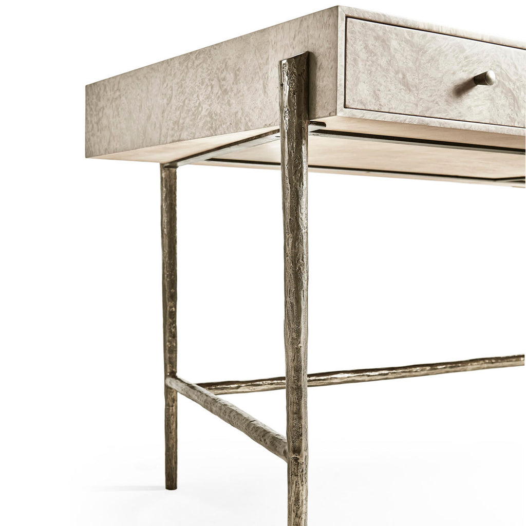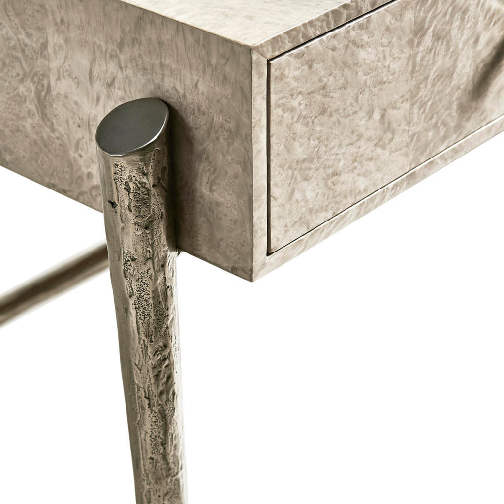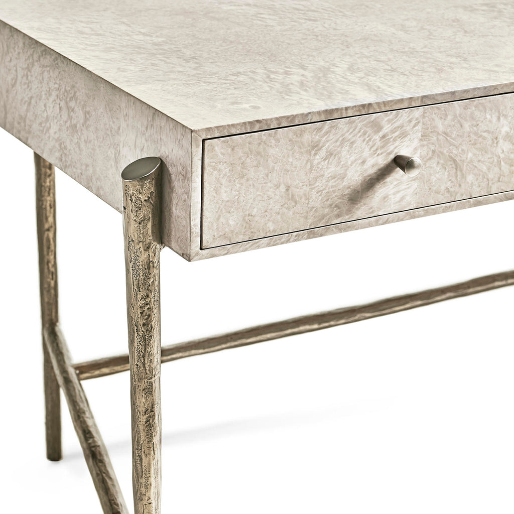A showstopper of Jonathan Charles’ Water portfolio, the Surge Madrona Burl Desk stands apart from a world of standardized choices. Inspirational design elements lead with a mesmerizing butcher block top honed from Madrona Burl finished in Smoke Gray. Organically textured Stainless Steel straight line legs finished in Satin White Brass offer delightful contrast while four drawers lined with supple Moore & Giles Hudson Smoke Leather provide interior storage. With an alluring surface and contrasting forms, Surge is sure to captivate audiences in contemporary interiors.
