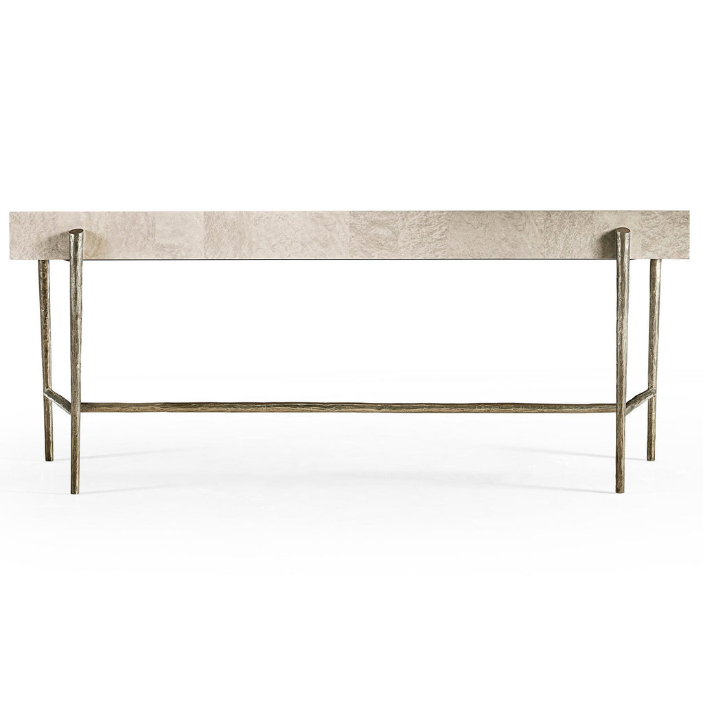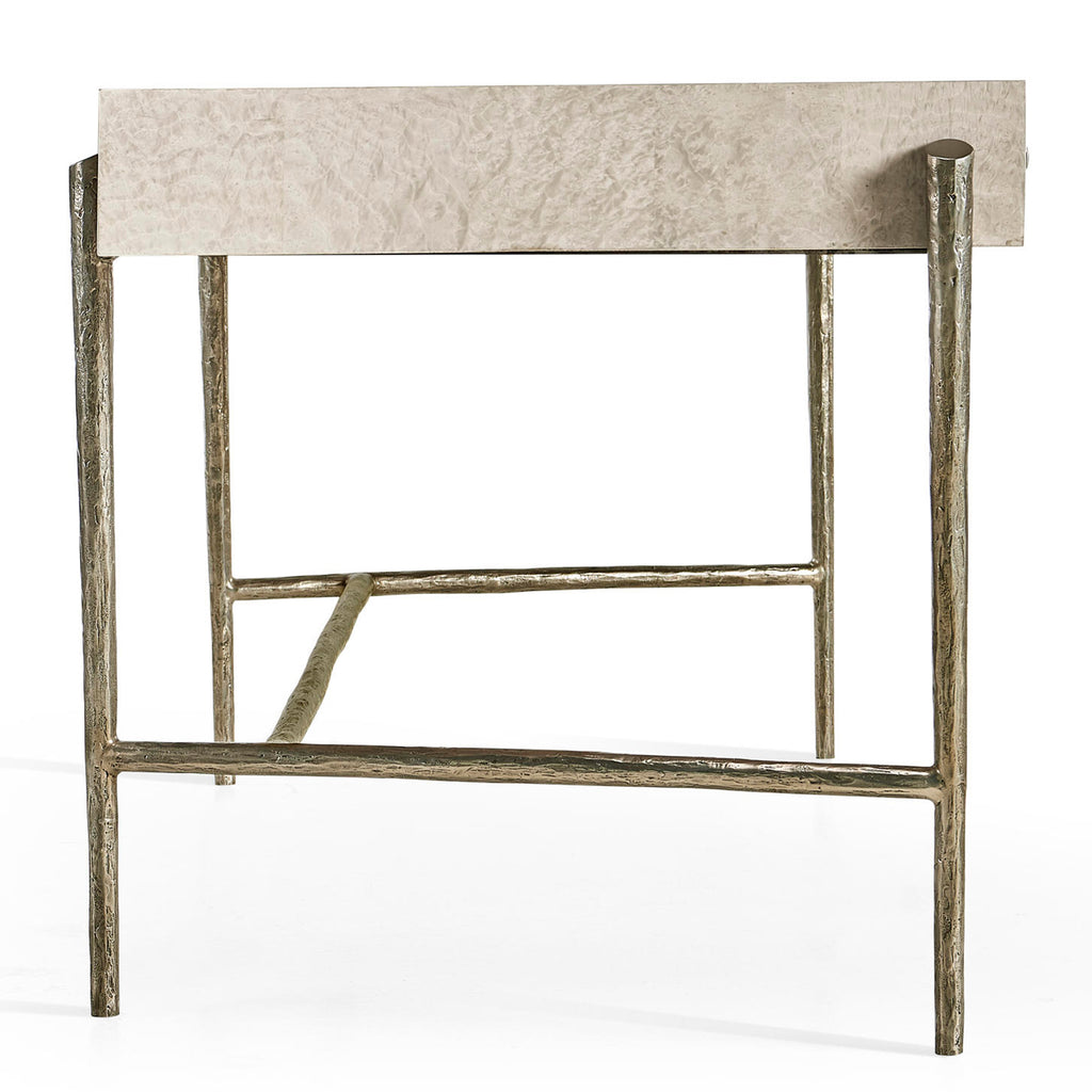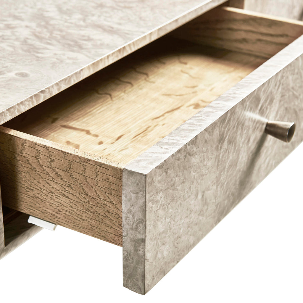 A showstopper of Jonathan Charles’ Water portfolio, the Surge Madrona Burl Desk stands apart from a world of standardized choices. Inspirational design elements lead with a mesmerizing butcher block top honed from Madrona Burl finished in Smoke Gray. Organically textured Stainless Steel straight line legs finished in Satin White Brass offer delightful contrast while four drawers lined with supple Moore & Giles Hudson Smoke Leather provide interior storage. With an alluring surface and contrasting forms, Surge is sure to captivate audiences in contemporary interiors.