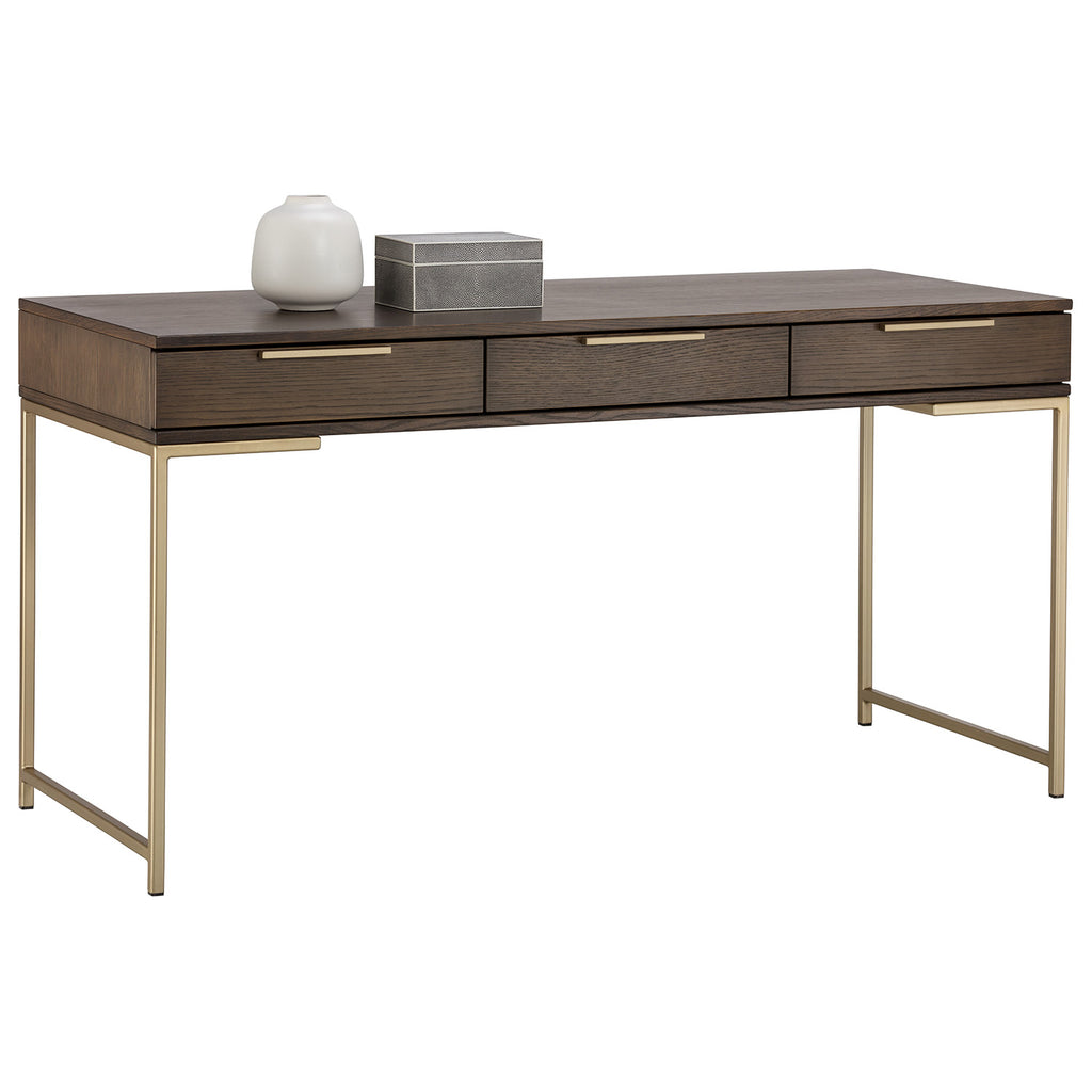 A modern desk designed to add a beautiful touch to office spaces. Crafted from oak wood veneer with three soft closing drawers for ample storage. Black iron hardware completes the look