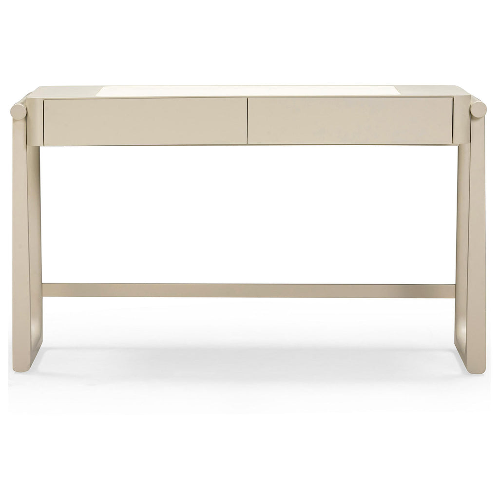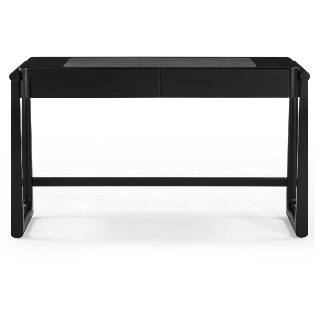 The Alfalfa Desk brings chic utility with two smooth-glide drawers and a padded work surface wrapped in ultra-cleanable, yacht-grade vegan leather - pen marks and heavy typing, no problem. A glossy lacquer finish adds a sleek touch, available in taupe or black.