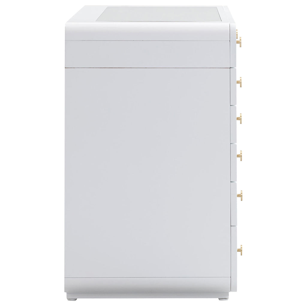 Introducing the Hollywood White Vanity Desk: Your ultimate #GRWM station! Decked out with metal hardware and a top drawer lined for all your treasures. This beauty boasts a spacious tabletop mirror to catch that good light, making your makeup pop and those selfies fire while ensuring cleanup is a breeze. With tons of drawers, including some shallow ones, it's all about keeping your products organized and easily accessible. Pair with our Lola vanity mirror to complete the look.
