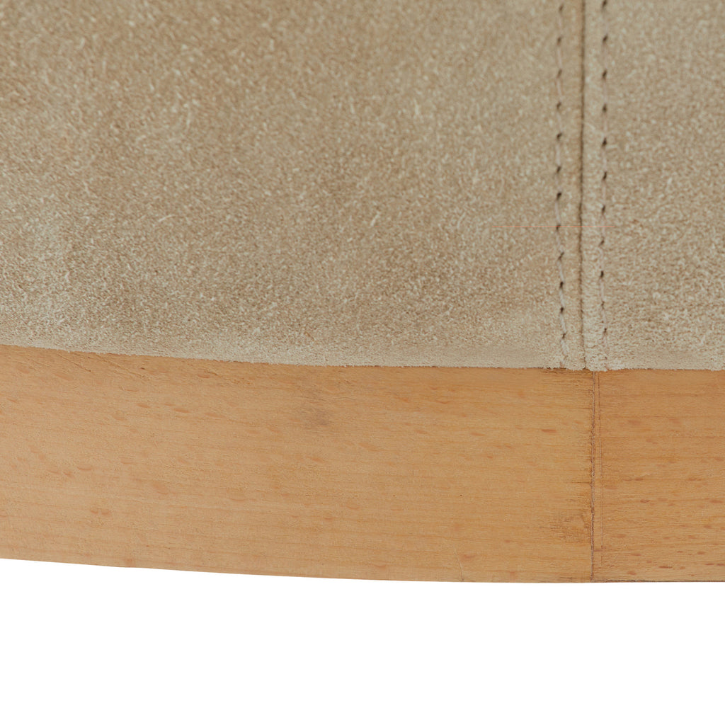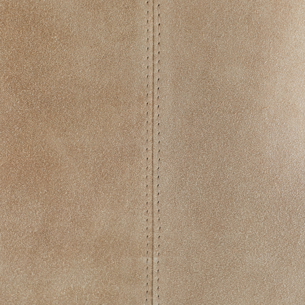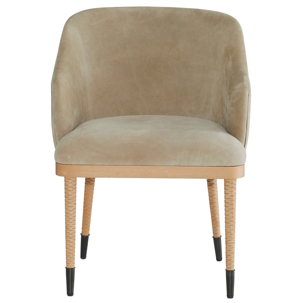 A comfortable dining or living room option, the Hershel delivers a modern mix of materials. The taupe suede seat features a slim profile with a softly curved back and demi arms that cradle the body. Legs are crafted from blonde beech wood with a light texture and capped in blackened bronze iron ferrules. Suede will vary.