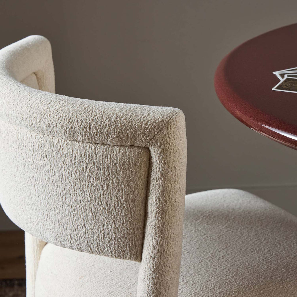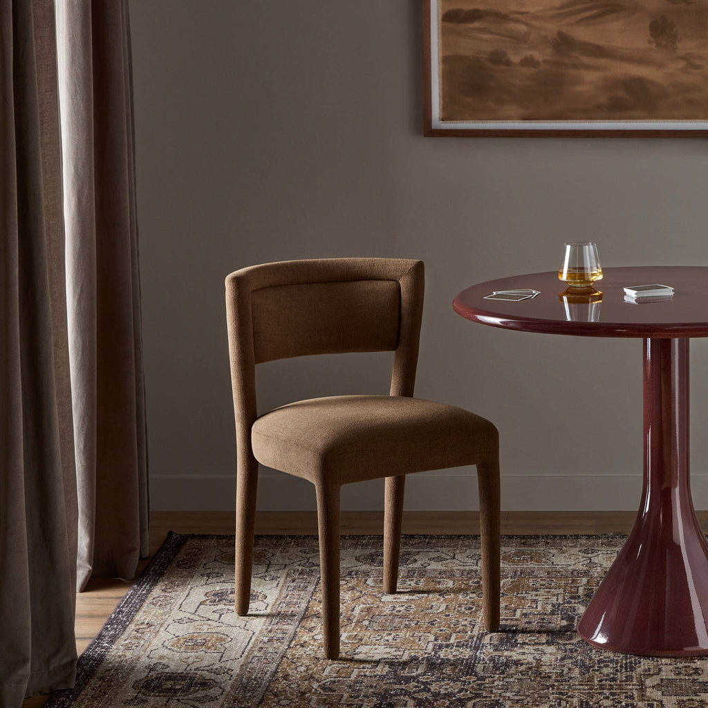 Featuring a barrel back design for comfort, an armless dining chair is fully upholstered in an earthy mushroom Crypton® performance fabric. Tapered cylindrical legs connect around the back frame. Crypton® performance fabric is specially engineered for protection against stains, moisture and odor.