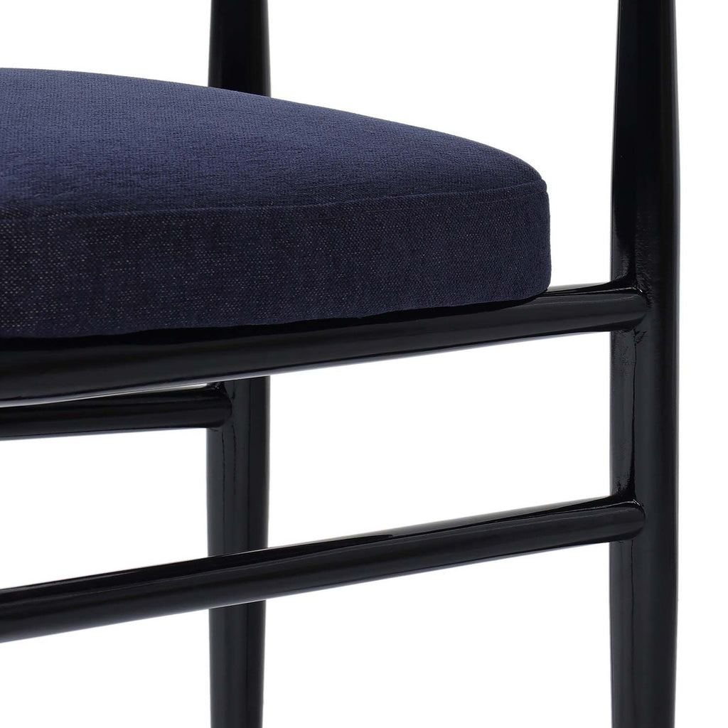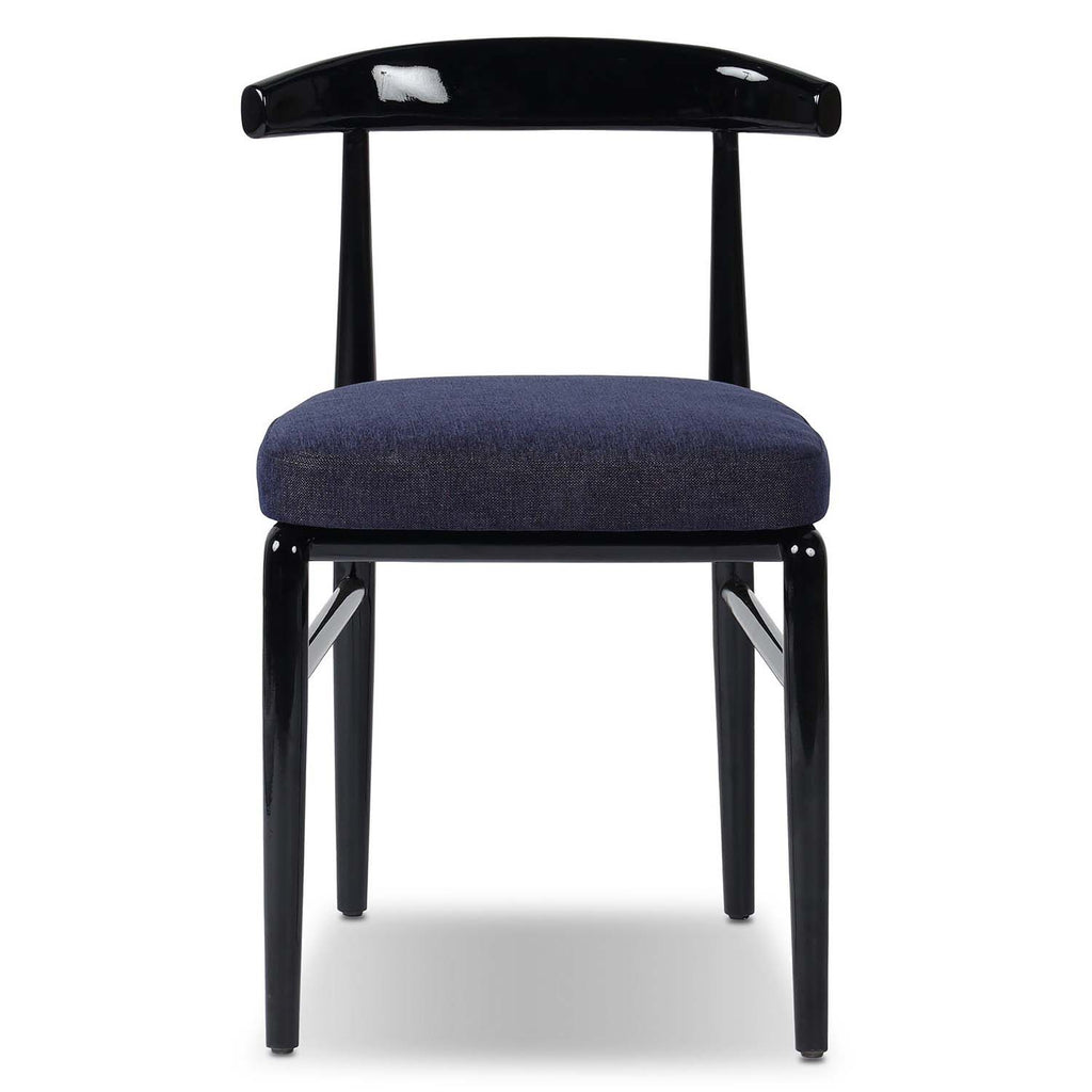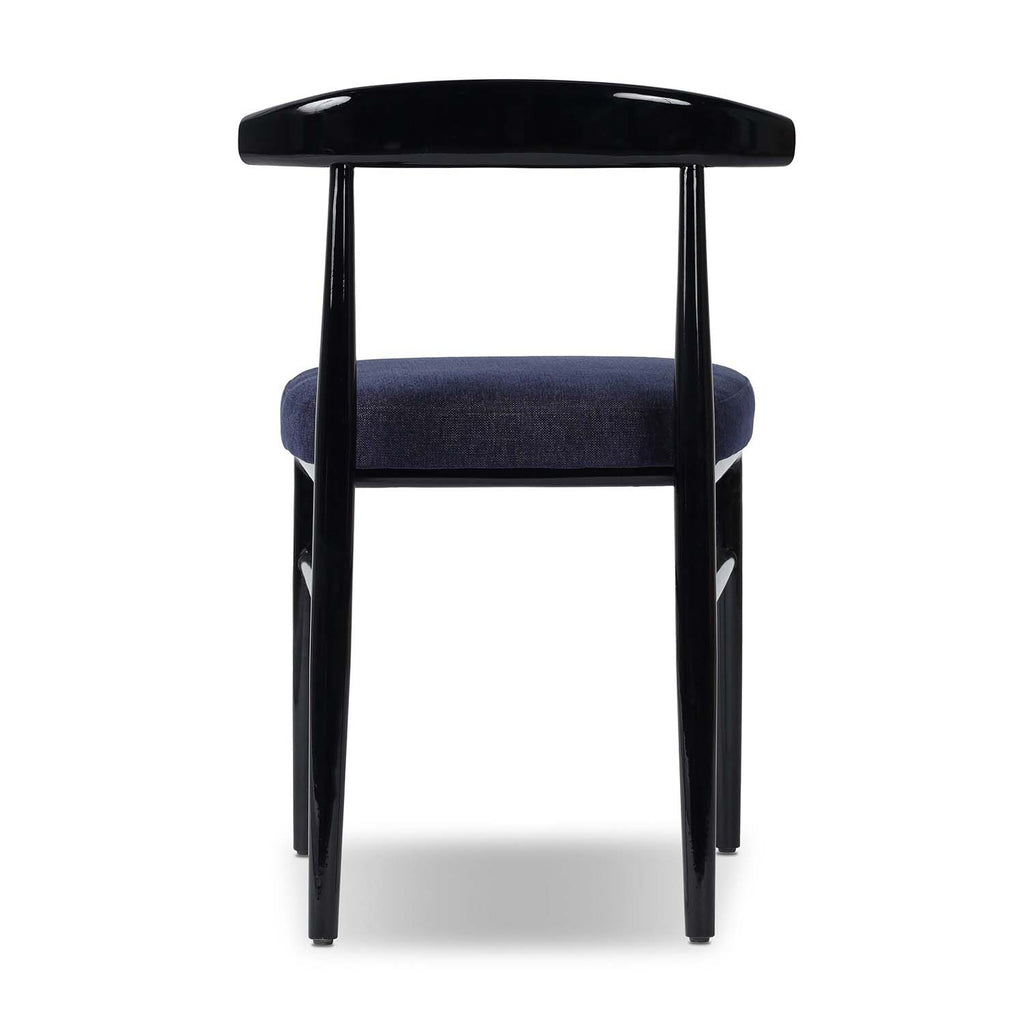Echoing lacquered seating from another era, this glossy dining chair features mahogany construction, a timeless back, and royal blue upholstery.