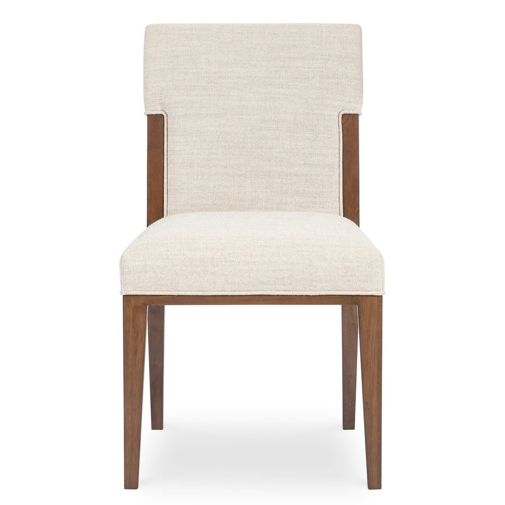 The Eleana Dining Chair showcases a harmonious mix of Light Caramel walnut veneer and beige fabric upholstery, complete with welt trim and tapered wooden legs. Designed for both style and comfort, its understated elegance complements a wide range of dining tables, making it the ideal choice for modern, transitional interiors. Marrying sculptural refinement with an effortless sense of luxury, the Eleana collection is a masterclass in contemporary elegance. The series, imbued with an effortless sense of sophistication, where sculptural silhouettes meet richly textured materials to create pieces that feel at once timeless and of the moment. Versatile in both scale and sensibility, Eleana's thoughtful proportions and nuanced finishes bring a sense of depth and harmony, lending itself seamlessly to a range of interiors, from intimate city dwellings to expansive retreats. Infused with a relaxed yet polished sensibility, Eleana embodies the essence of modern living; stylish, inviting, and intuitively crafted for the way we live today.