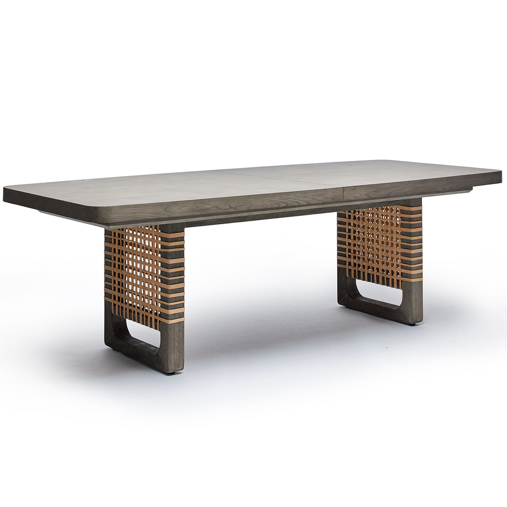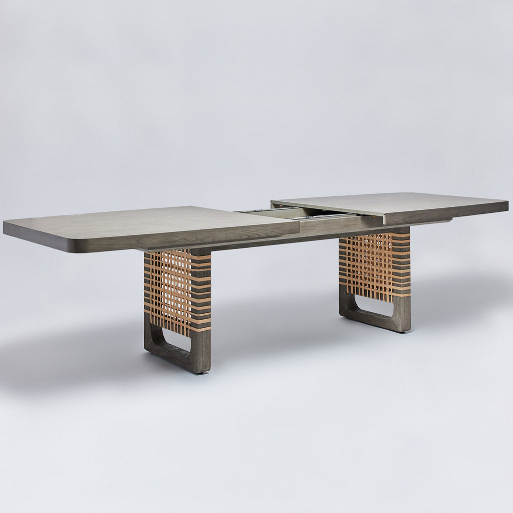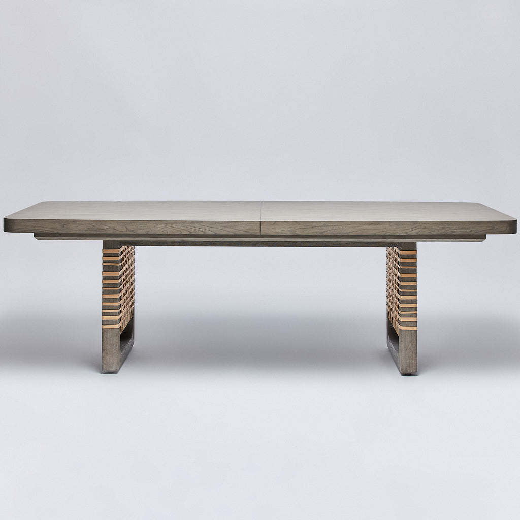 A dash of midcentury and a touch of organic, the Osprey Extension Table, including a 24in W removable leaf extension, is crafted of washed grey wood with natural rattan and grey cerused accents. This item is made of solid wood. Item will not be exactly as pictured, subtle deviations in hue after finishing can be expected as a result of natural variations in coloration of the base material.
