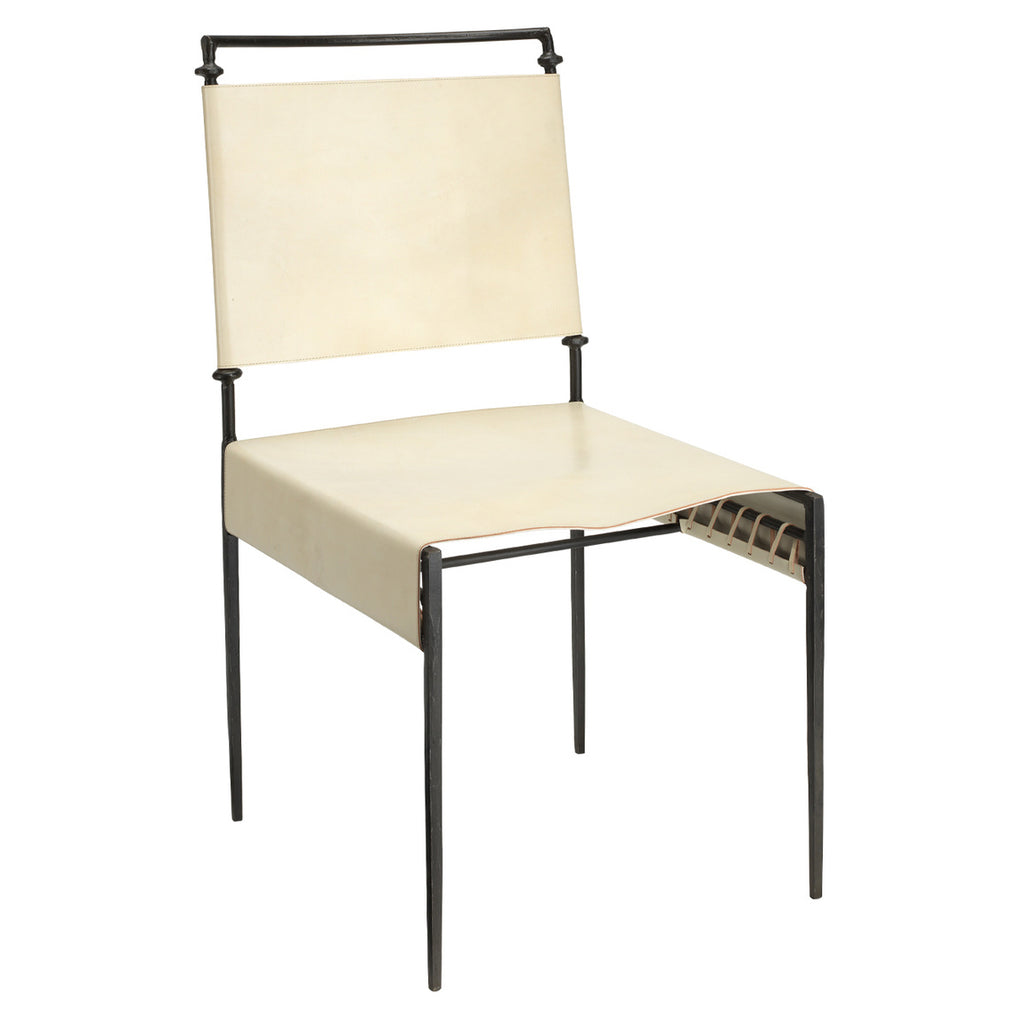 Buttery soft off-white leather is backed with white canvas and cinched around black hand-forged iron legs in this artisan crafted dining chair. It’s a little bit urban, a little bit rustic chic, and with the incredible detail on the back of the chair they look stunning pushed up against a dining table.