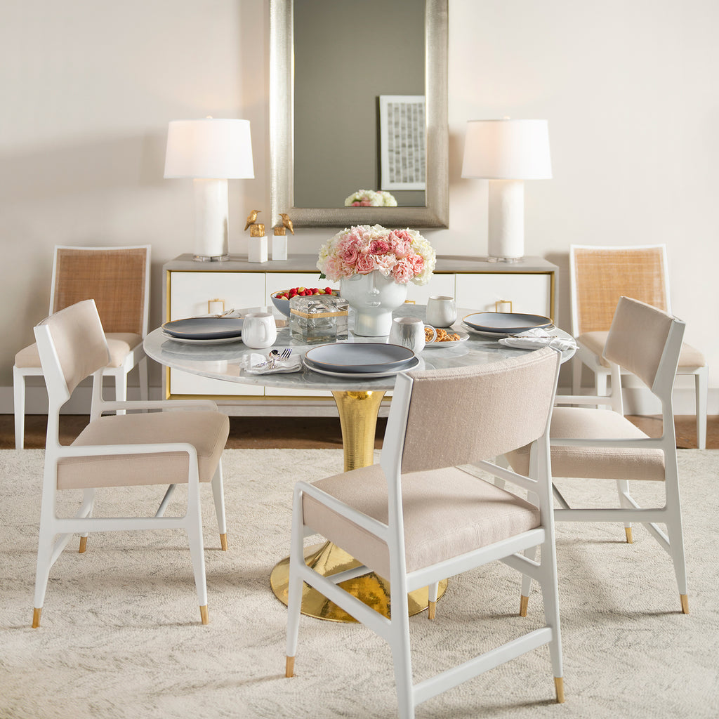 The classic lines and elegant simplicity of the V&H Ernest complement a wide variety of home decor schemes. The handwoven cane back, and linen seat provide contrast and a textural counterpoint to its modern lacquer finish.