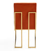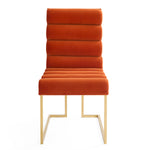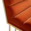 Minimalist comfort gets a modernist makeover—we’re taking our definition of leaned-back luxury to the next level with our Channeled Goldfinger Dining Chair in a bold and glamorous burnt orange velvet. Ultra-comfy channeled cushions and plush arm rests complement its perfect pitch on a pared down polished brass frame. A little bit '70s, a lot today.