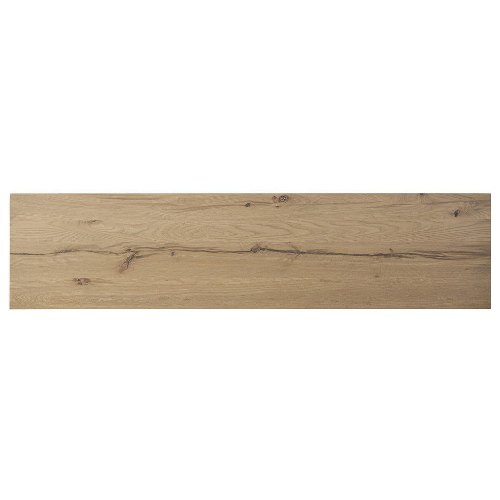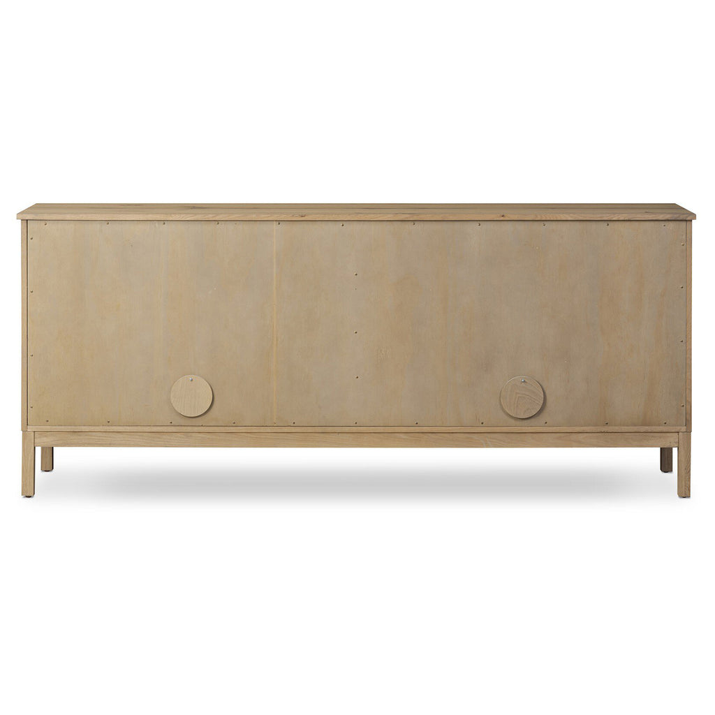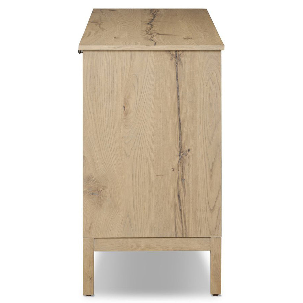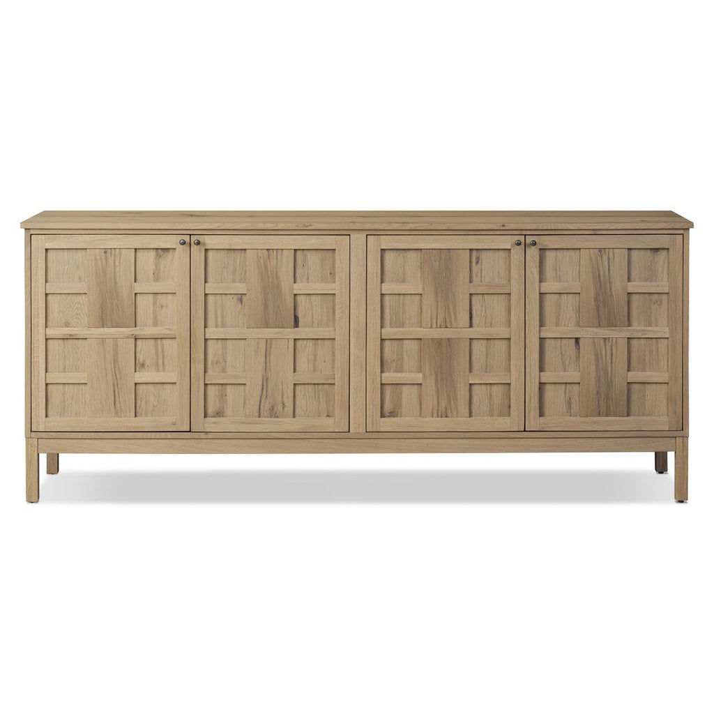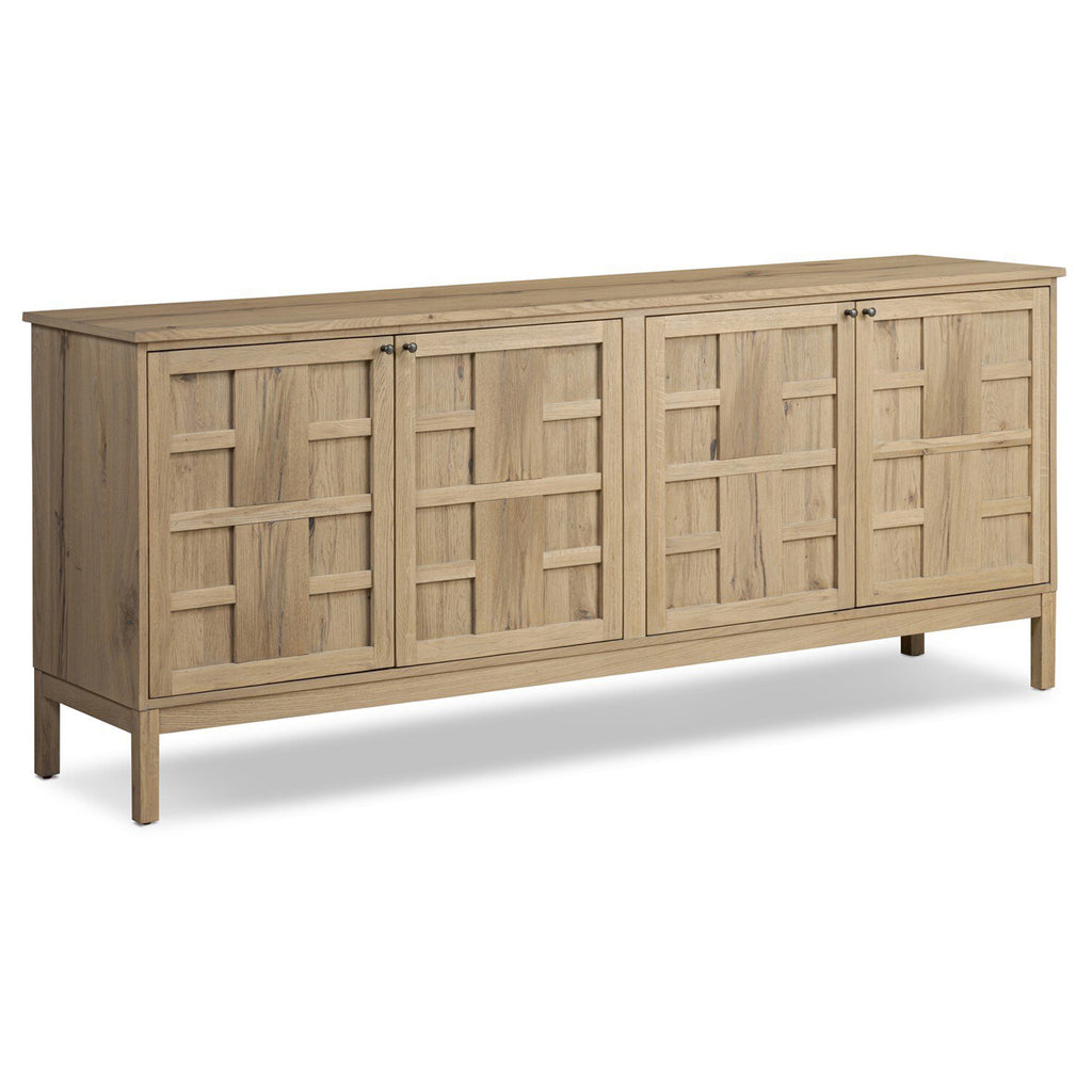 A transitional piece that works into your collection with ease. This solid oak sideboard features a light finish that highlights natural wood cracks and graining inherent to rich character woods. Grid-like patterned doors bring dimension to clean, simple shaping, while interior shelving awaits storage of serveware, table linens and more. Pieces vary; knots and cracks are common and reflect the beautifully natural character of oak.