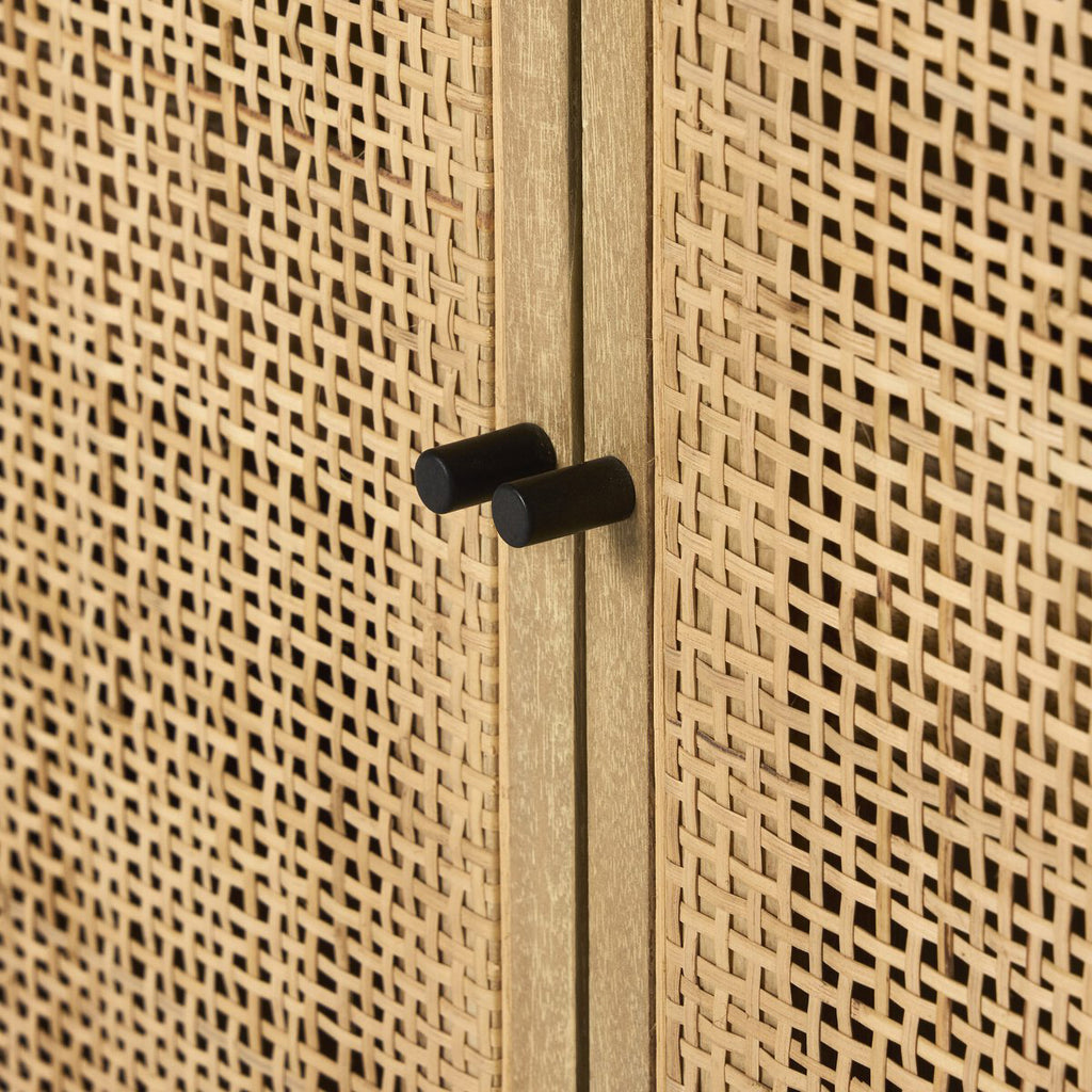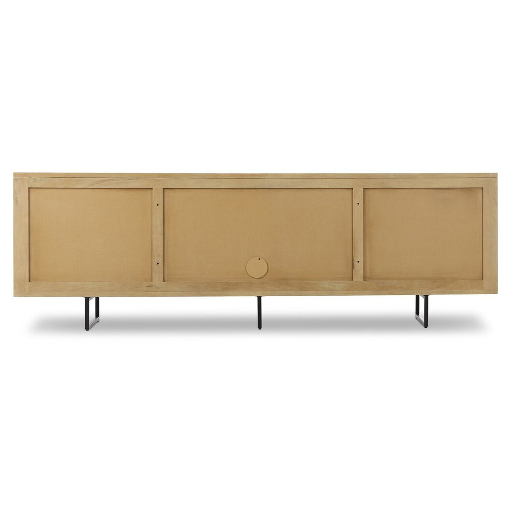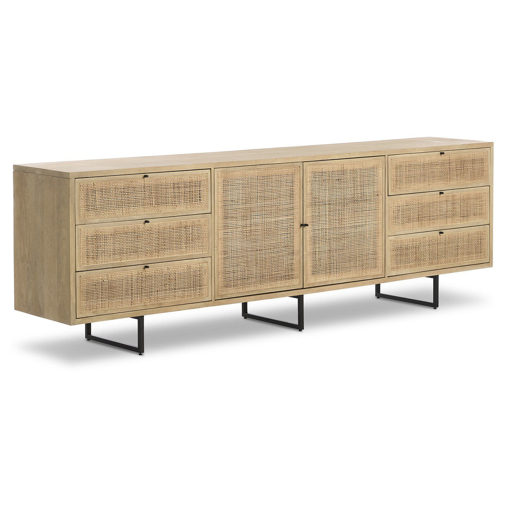 Midcentury-inspired style with an organic twist. Surrounded by mango casing, light cane weaves for a fresh, natural look. Finished off with angular gunmetal-finished iron legs. Plenty of interior storage for your favorite table linens and dinnerware.