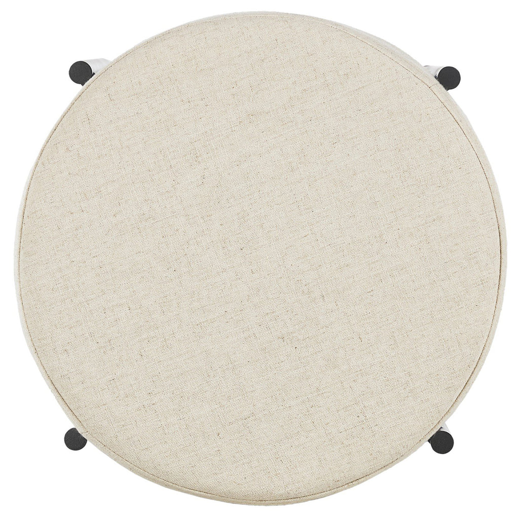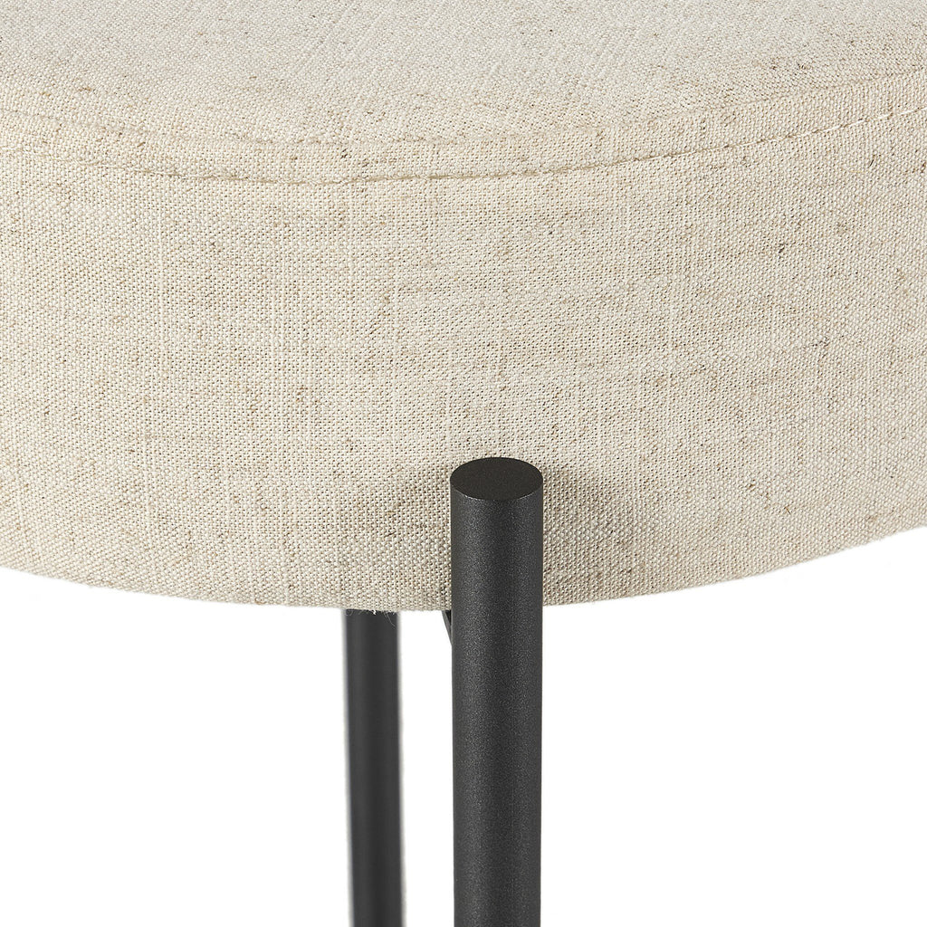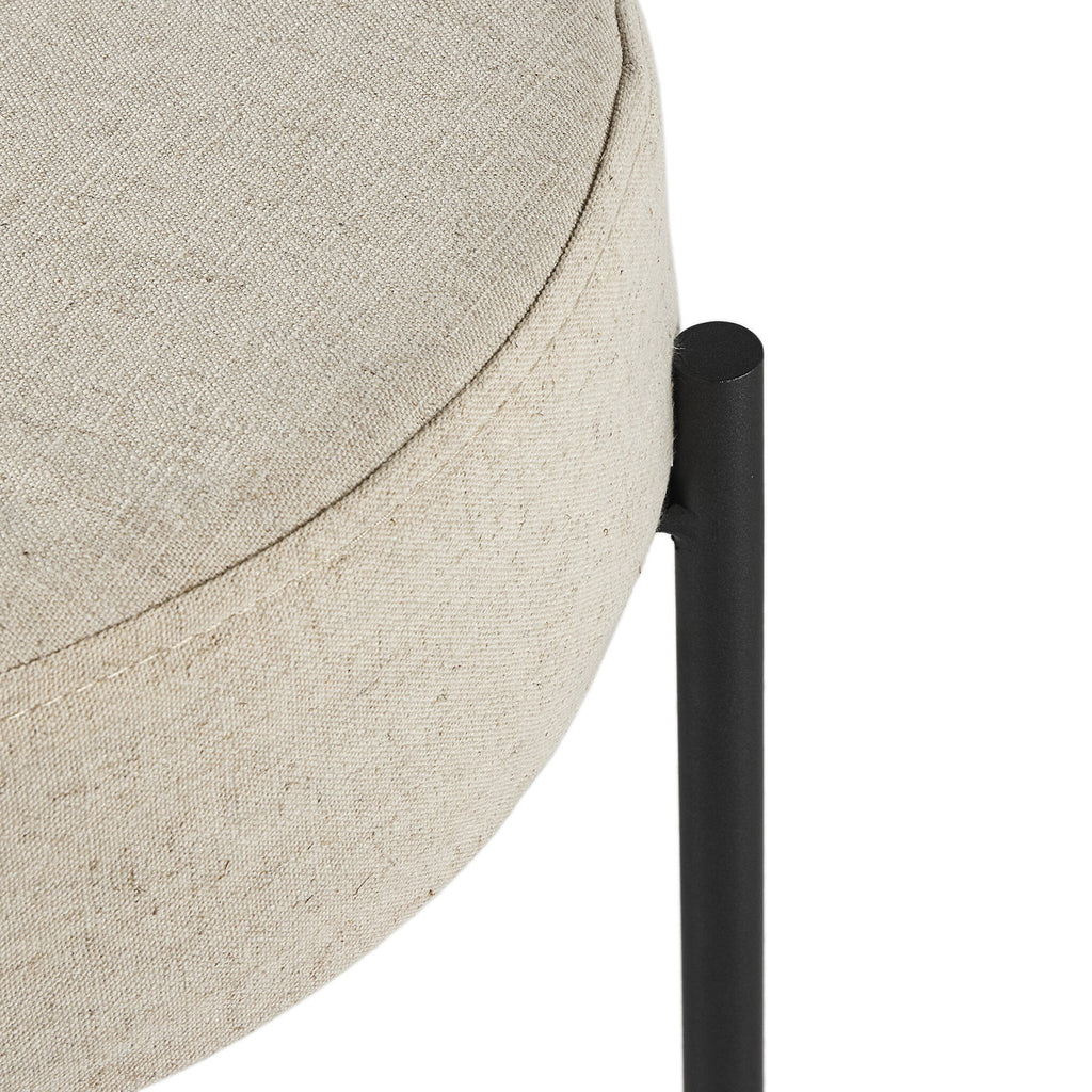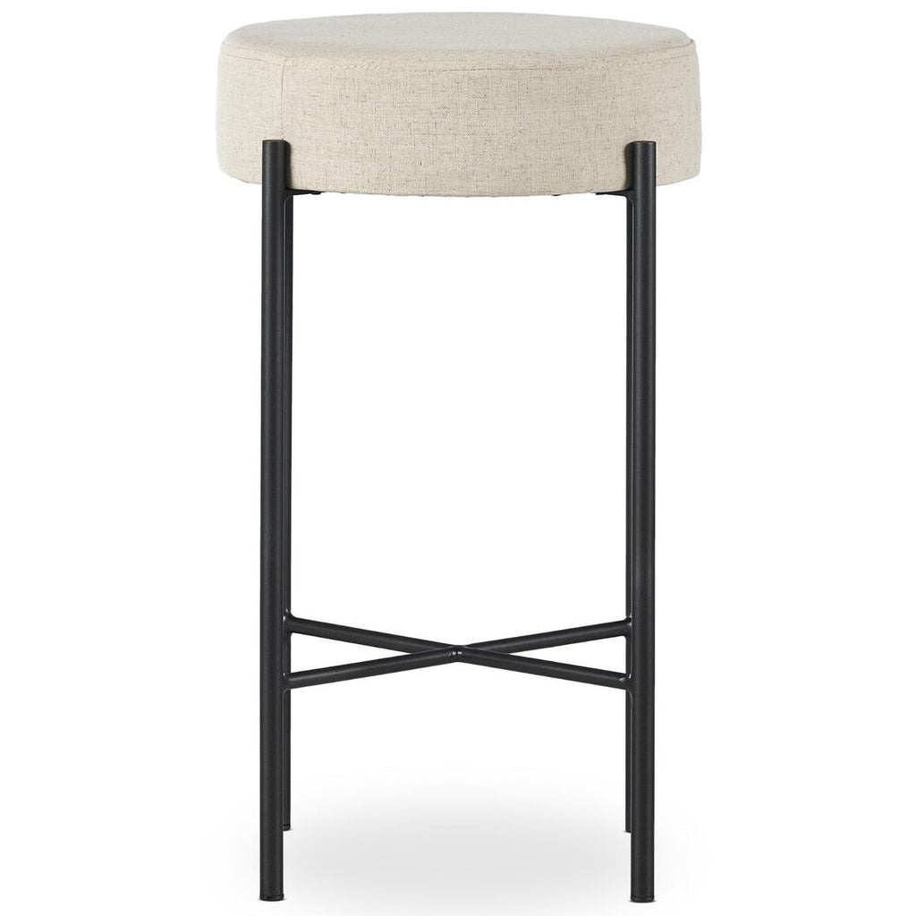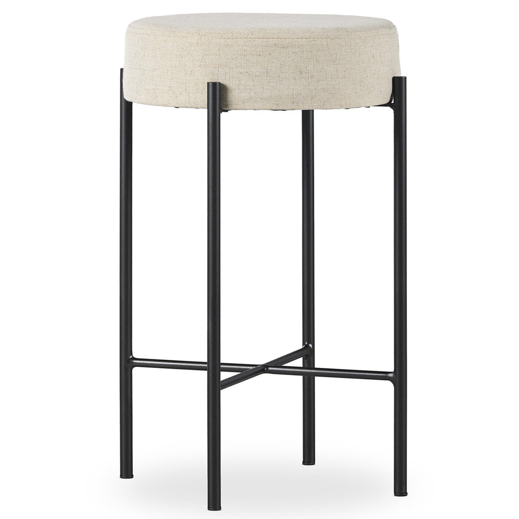 Slim and airy, gunmetal-finished iron legs form a cradle-style frame for Savile Flax perfromance fabric, perfectly sized for the counter.