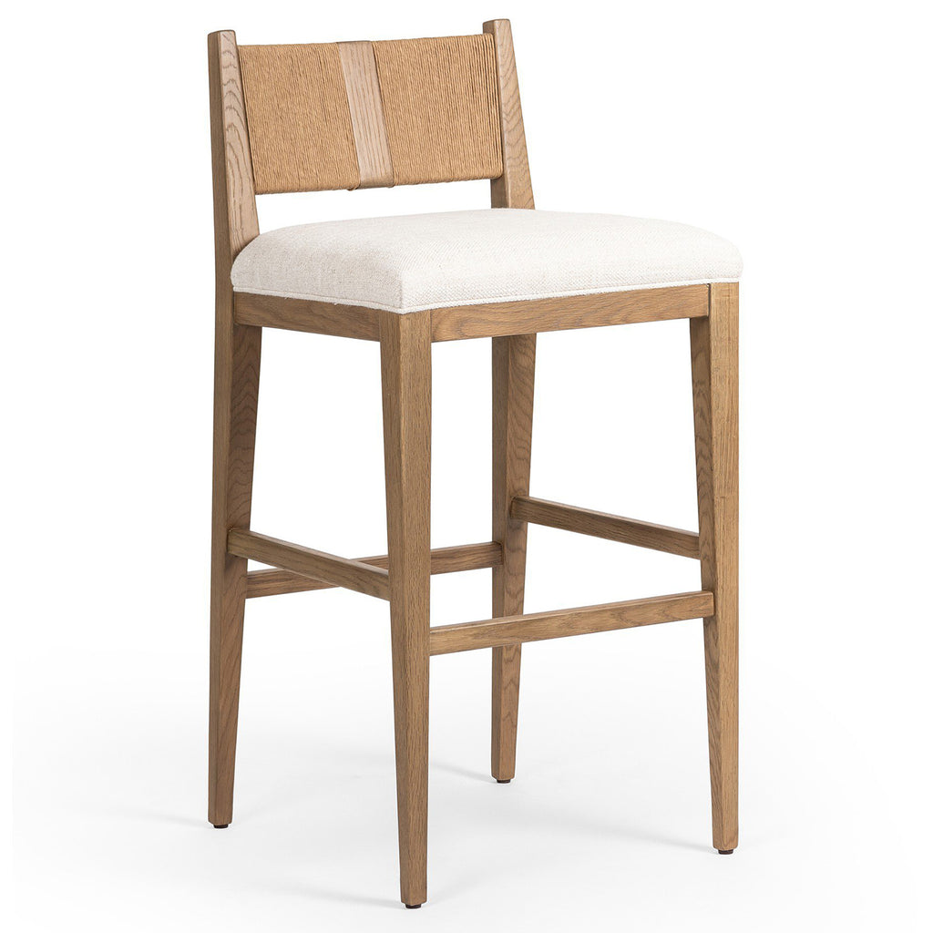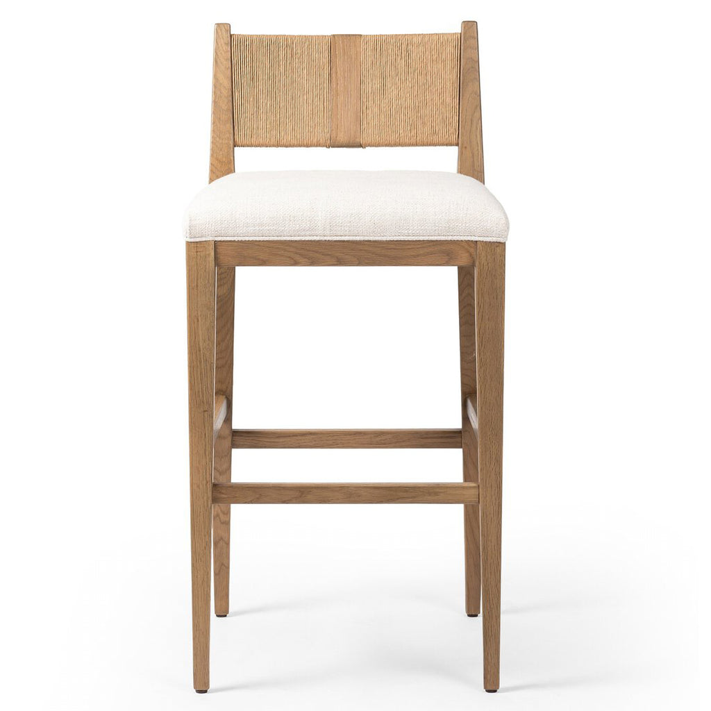 Unique materials make this bar stool a standout. A low, perfectly pitched backrest is made from wrapped paper cord and aged oak, for a natural, textured look. Simple squared seating is upholstered in high-performance fabric, perfect for entertaining. Performance fabrics are specially created to withstand spills, stains, high traffic and wear, ensuring long-term comfort and unmatched durability.