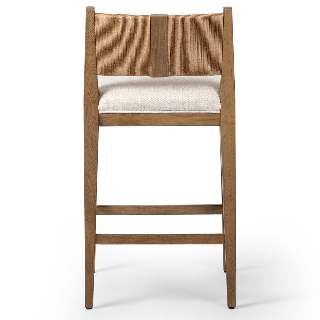 Unique materials make this counter stool a standout. A low, perfectly pitched backrest is made from wrapped paper cord and aged oak, for a natural, textured look. Simple squared seating is upholstered in high-performance fabric, perfect for entertaining. Performance fabrics are specially created to withstand spills, stains, high traffic and wear, ensuring long-term comfort and unmatched durability.