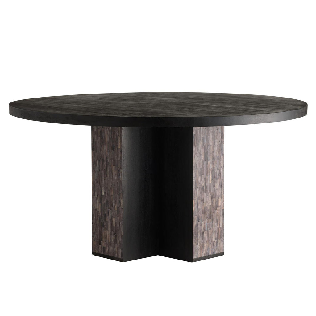Crafted from mango wood in an ebony finish, this 60-inch dining table features a carefully inlaid network of gray bone cascades down the front facing edges of this intersecting base. Comfortably accommodates four to six guests. Finish will vary.