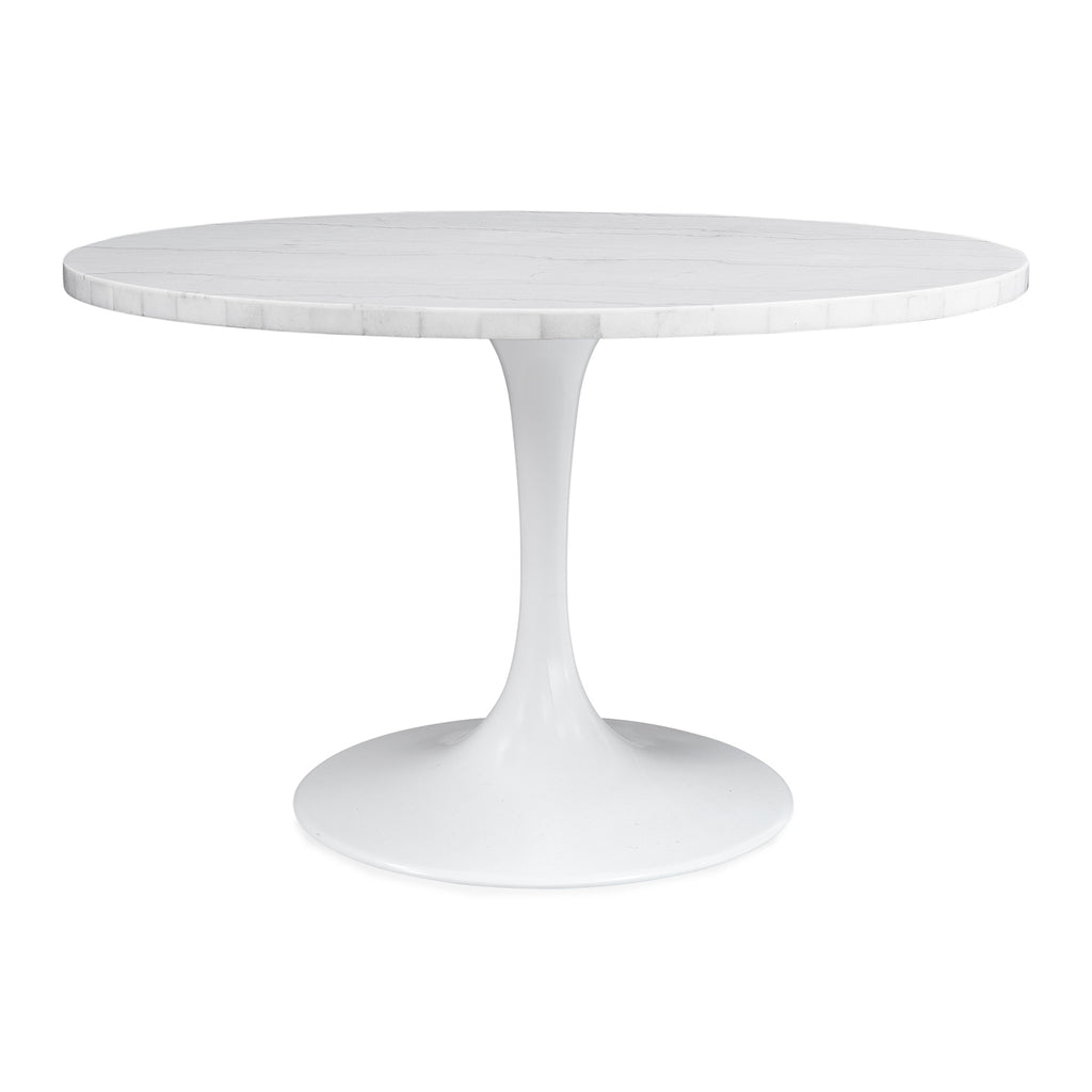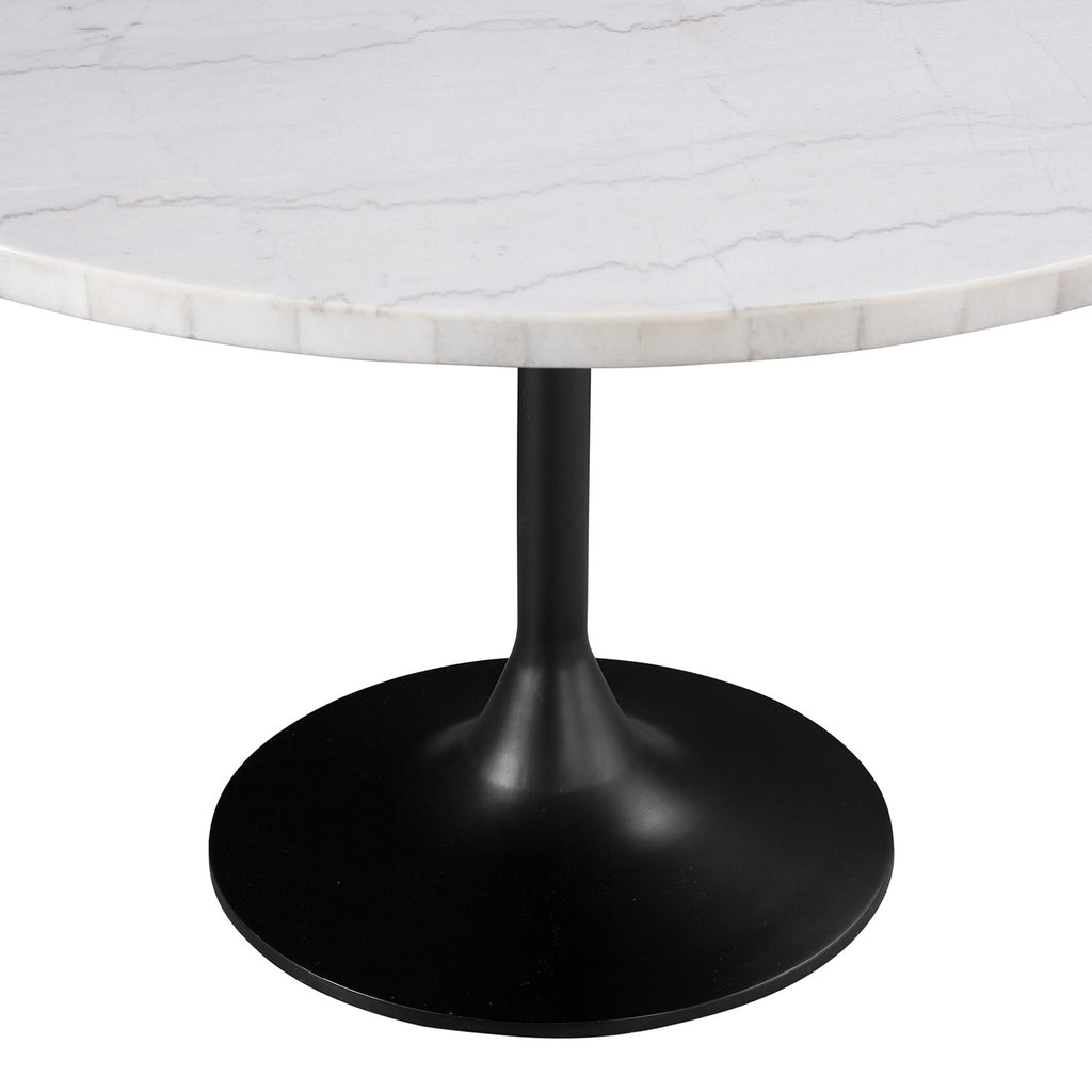 The Dunham Dining Table embodies modern sophistication with its pristine white marble top, enriched by subtle gray veining and natural deposits that add character and uniqueness to each piece. The table's silhouette is defined by a matte black/matte white metal tulip base, providing a contemporary twist on a classic design. At 48" in diameter, this table comfortably seats four, making it an exquisite centerpiece for smaller dining spaces or a stylish accent in a larger room.