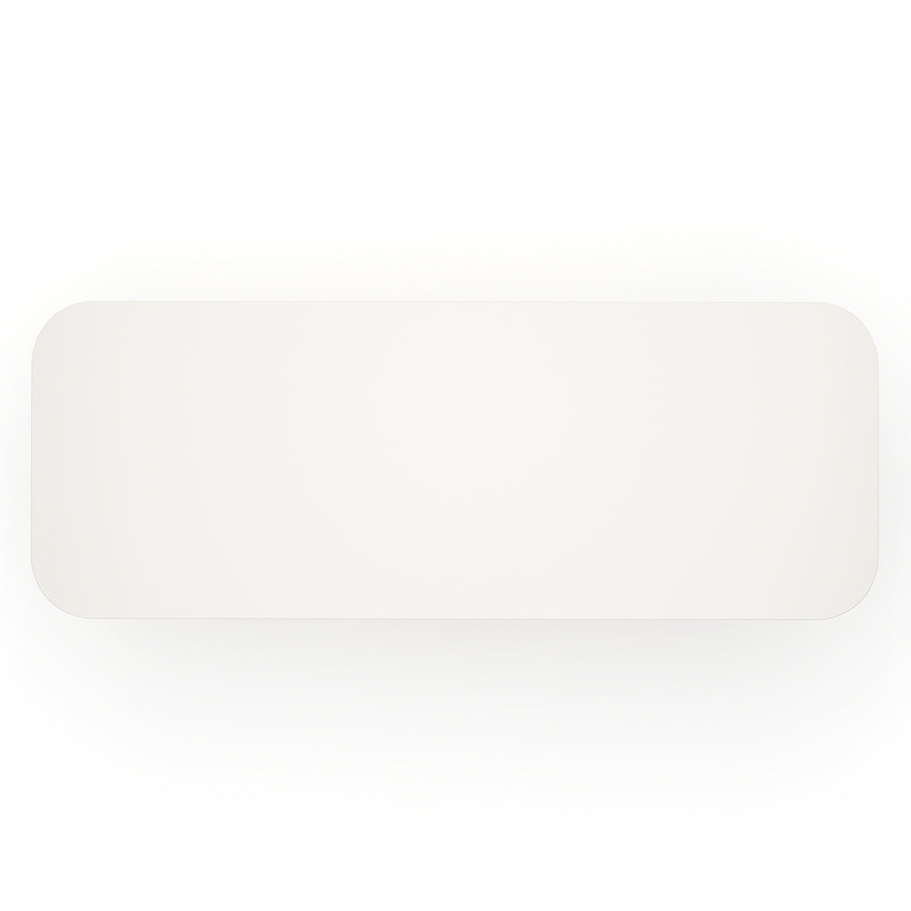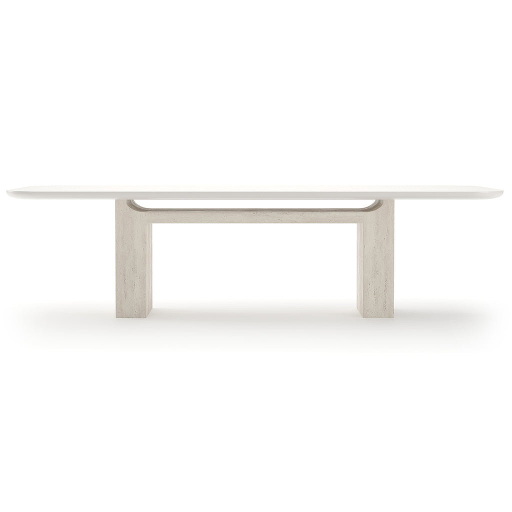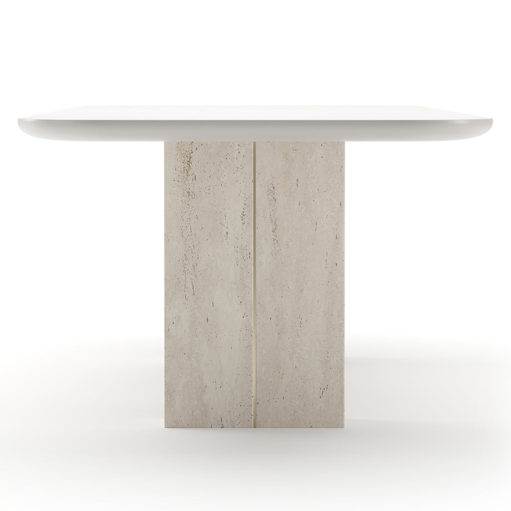 The Overlap Rectangle Dining Table Light features a Latte top accented with Whisper of Gold spline and supported by unfilled Travertine pedestals. Its sophisticated design brings modern luxury to your dining space.