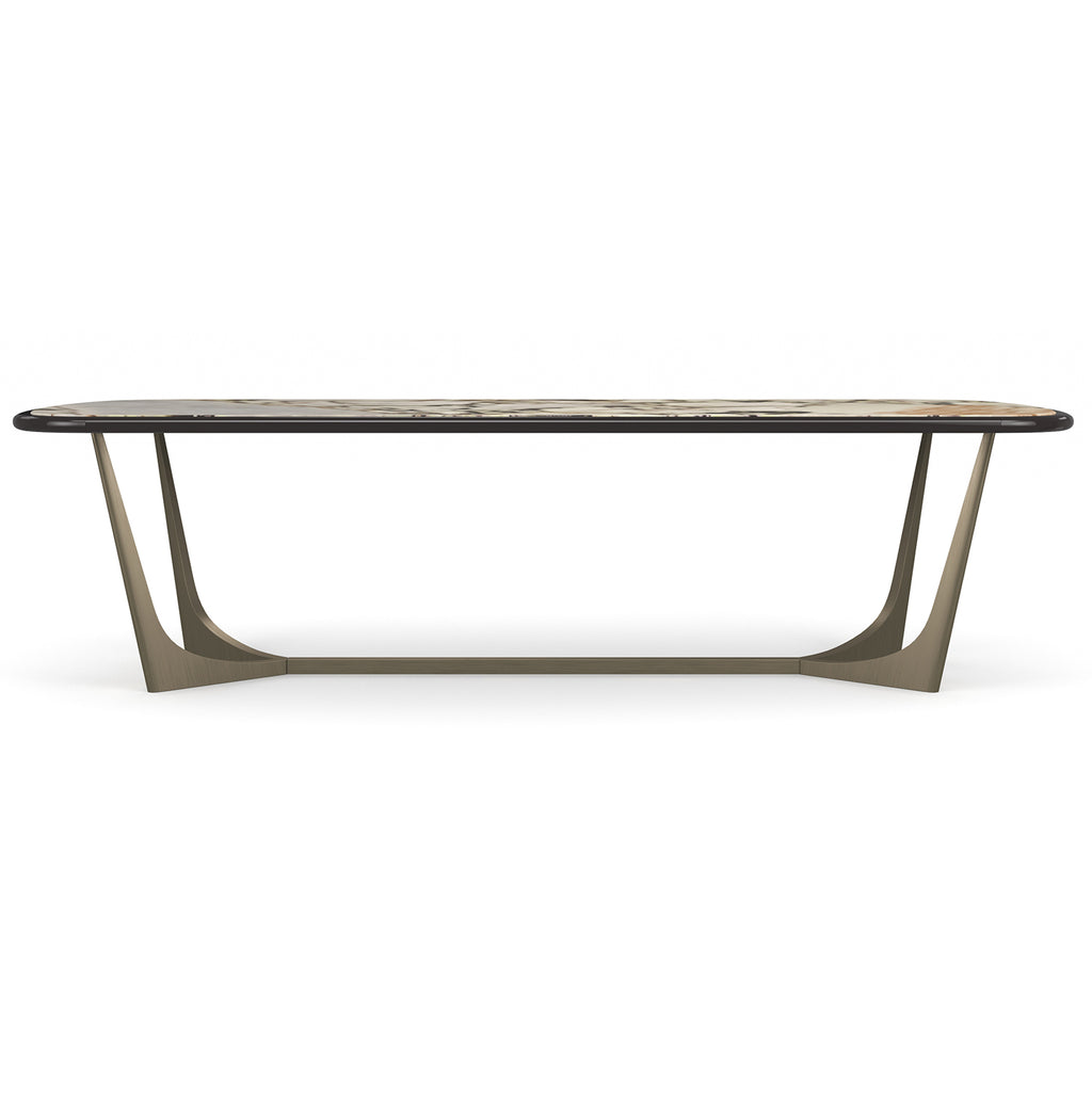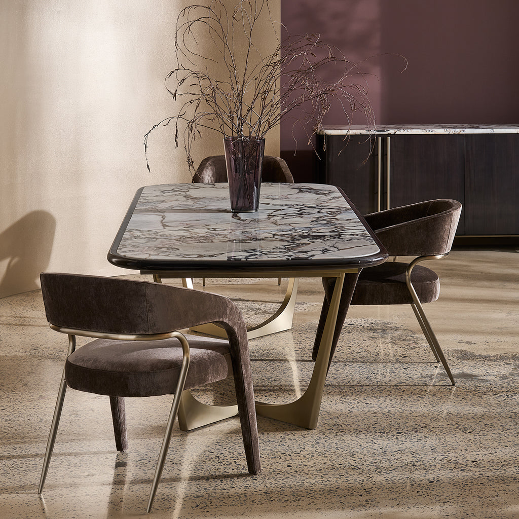 The Vena Dining Table is a showstopper. This piece celebrates Calcutta Viola stone with its richly figured veins in plum, burgundy, inky browns and blacks. The stone is trimmed in hand-applied Tupelo veneers in a dark Otter Gloss finish. The top sits on a sweeping Brushed Gold metal base.