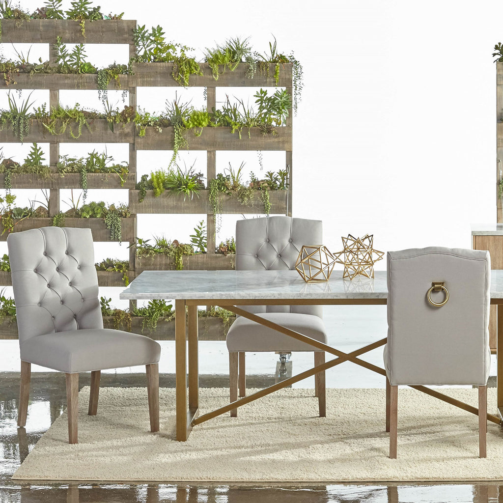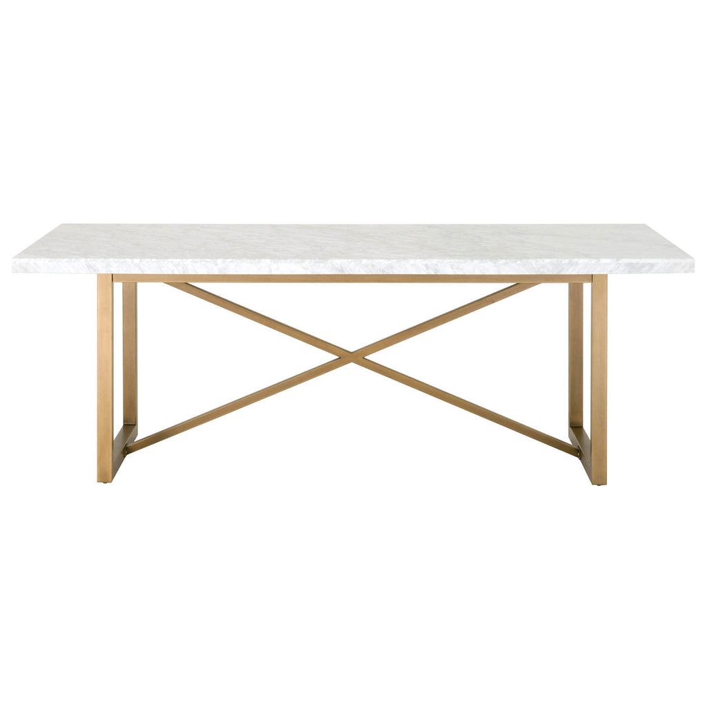 Transitional style dining table featuring White Marble veneer top over a Brushed Gold base. Tradition Collection's Carrera Marble is a 100% natural stone product imported from Italy. As such, variance from piece to piece is to be expected.