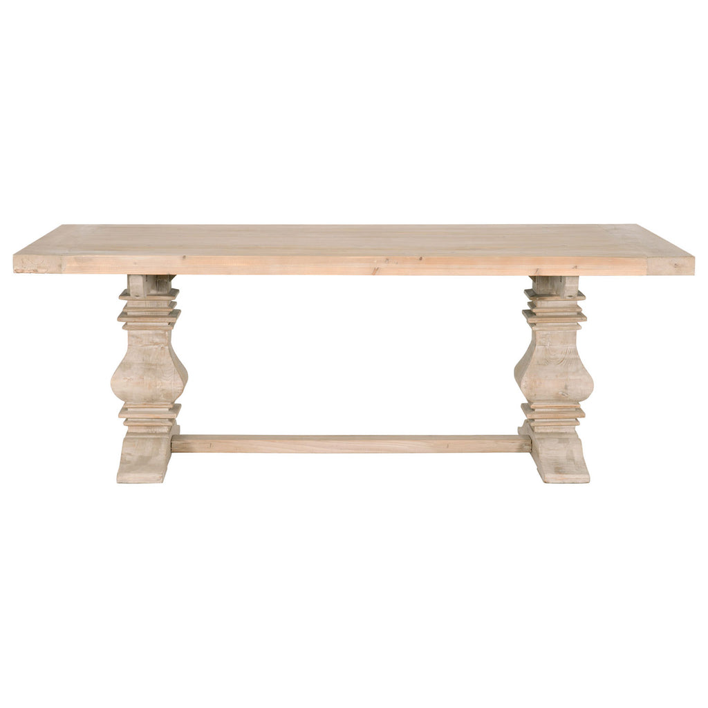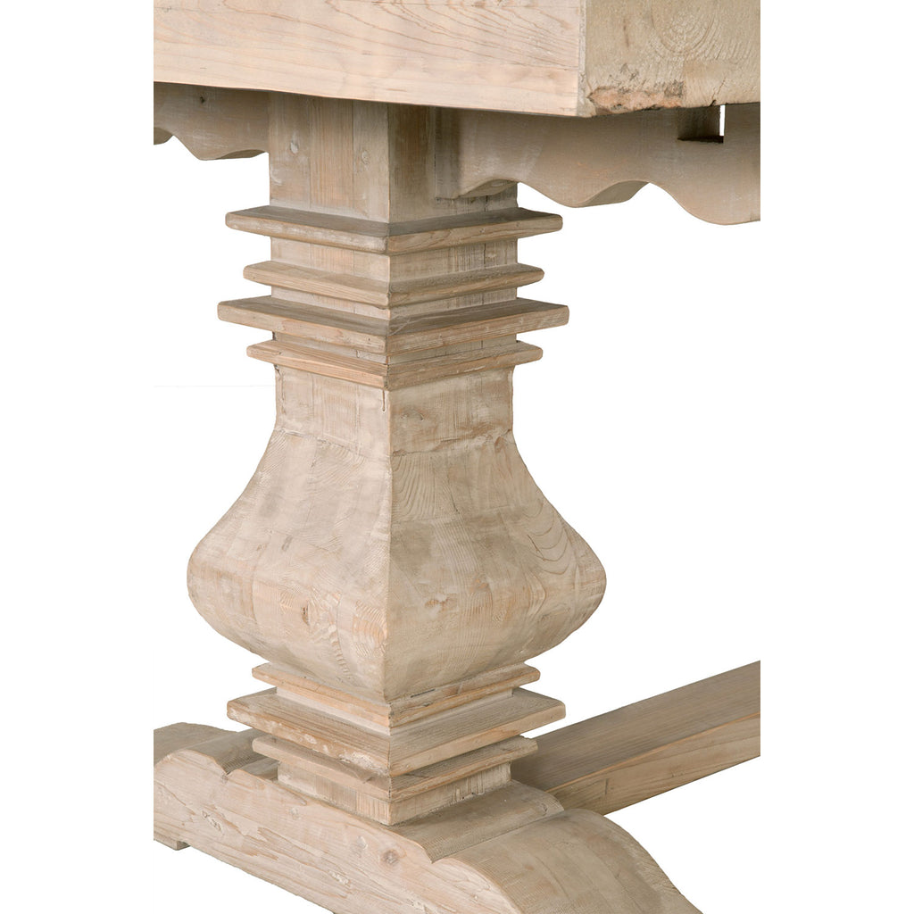 The Monastery transitional style extension dining table featuring Recycled European Pine wood and decorative double pedestal base. Bella Antique Collection products are made with natural stone, antiqued metal, concrete, and reclaimed wood. These products include unavoidable variation in color, texture, uneven grain, blemishes, scratches, marks, and cracks. These features are not defects, but rather the material's natural characteristics.
