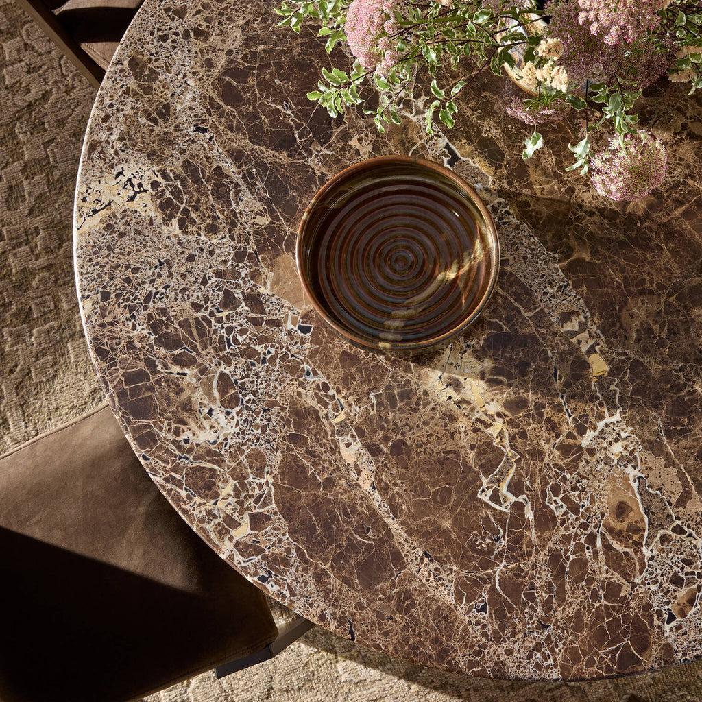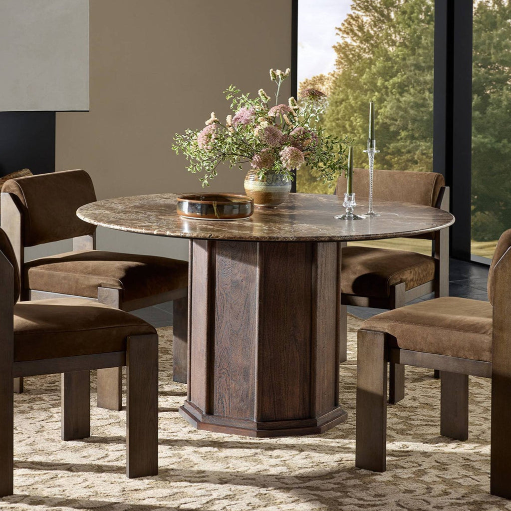 Mixed materials refresh this traditional dining style, pairing a thick, wide base of dark brown acacia with brown marble rich with natural veining. Two-step detailing on the base elevates the whole look.