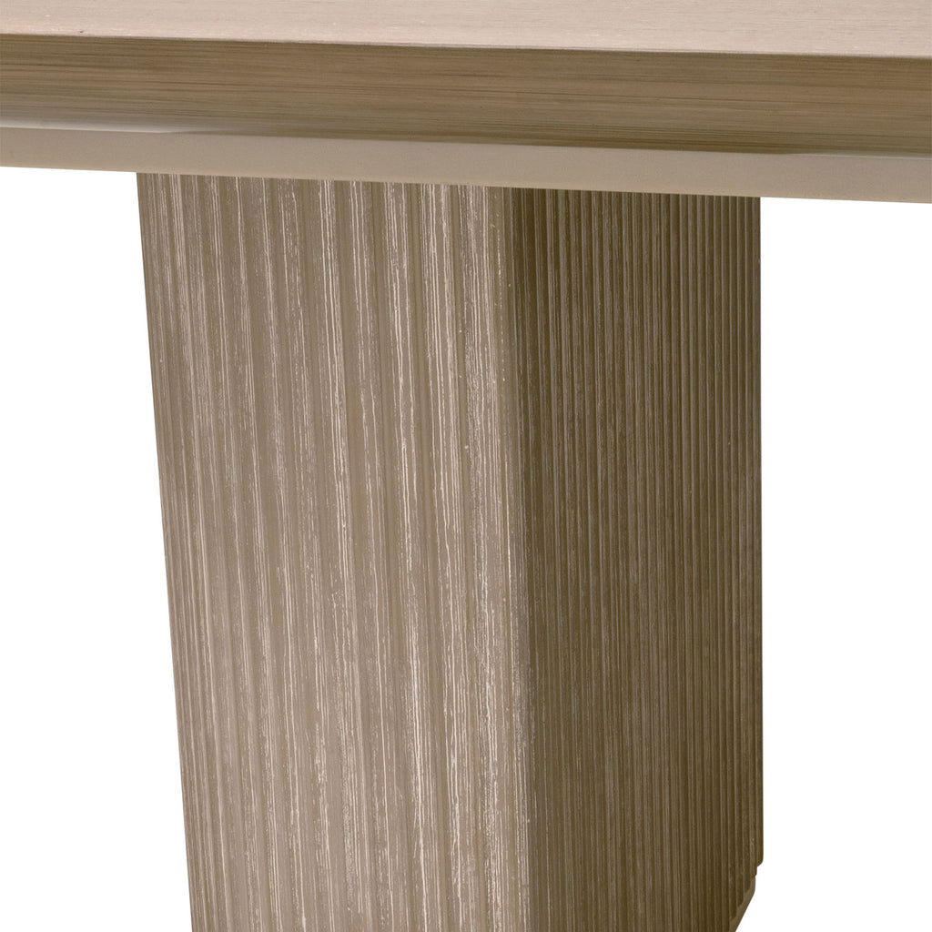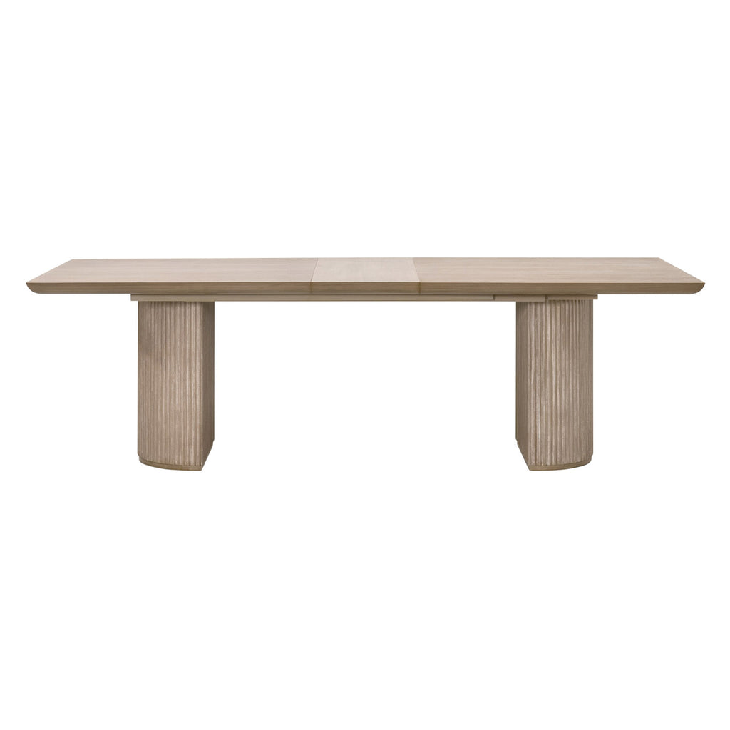 Designed in a transitional style with a refined natural gray finish, this Halloway Extension Dining Table by Essentials For Living brings a balanced blend of modern design and versatility to any dining room. Built from solid acacia wood with acacia veneer, it features a striking reeded double column pedestal base that adds depth and architectural interest. The table extends from 84in to 100in with a removable 16in leaf, allowing you to comfortably seat up to eight people. The width is 42in and it has a 30.25in height. When not needed, the leaf can be stored separately to maintain a more compact space.