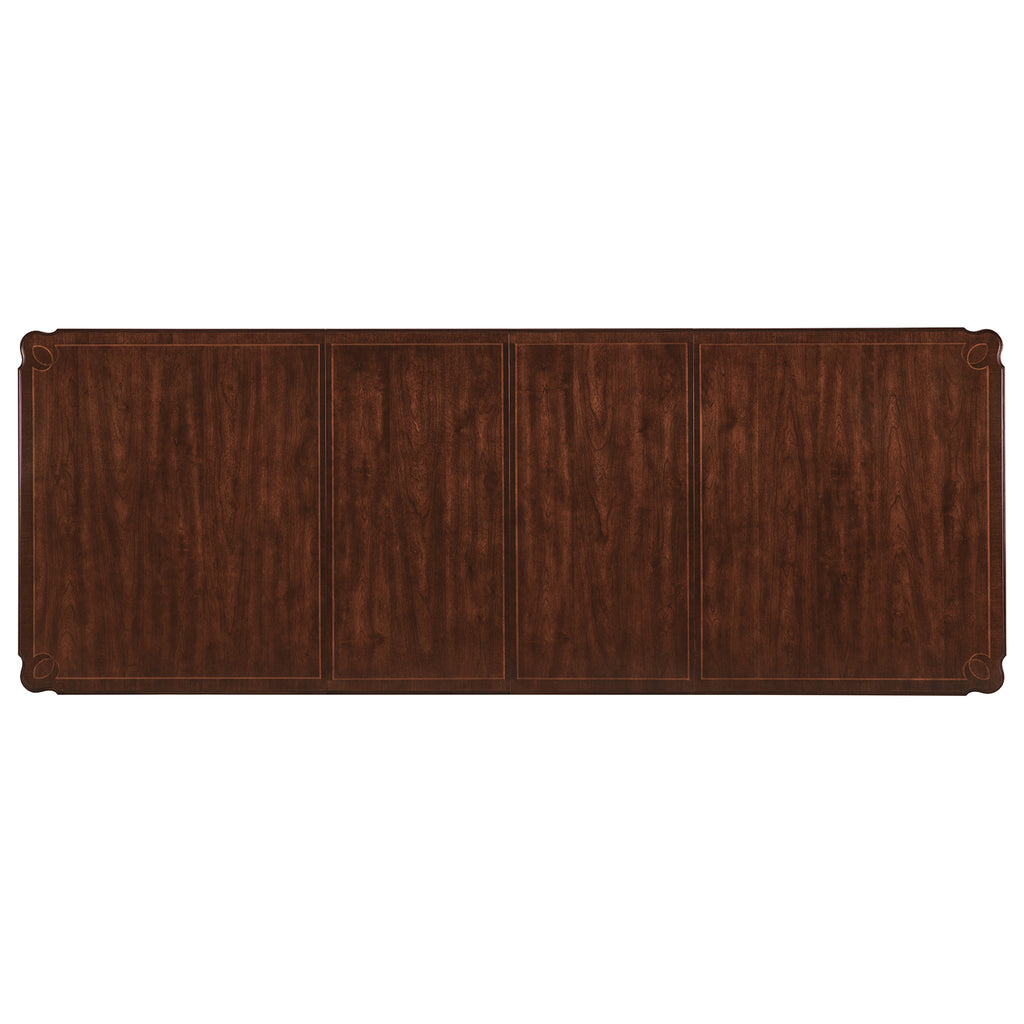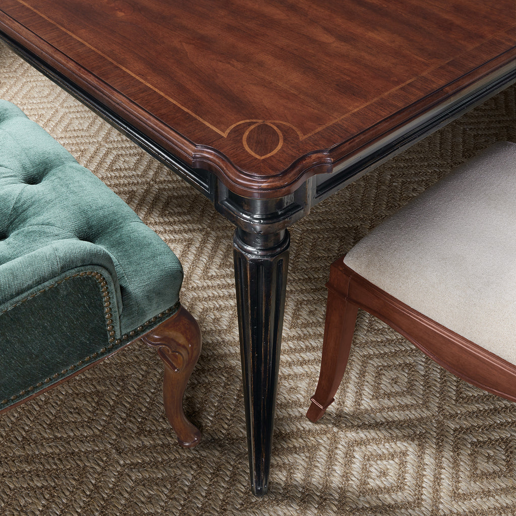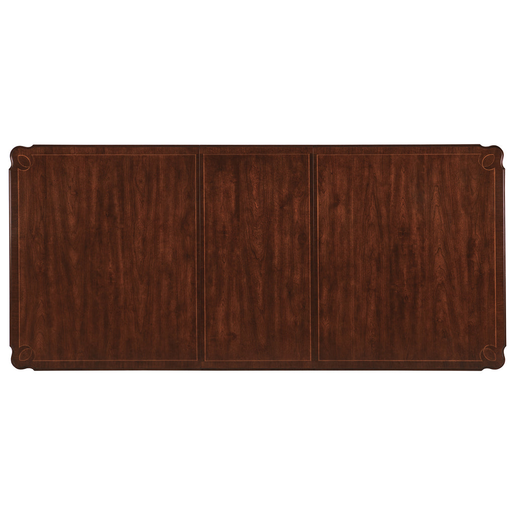 Grand yet warm and inviting, the Charleston Rectangle Leg Dining Table is crafted of Cherry and Walnut Veneers with intricate Maple Inlay and a Solid-Wood Edge top. The table base is finished in the vibrant Black Cherry patina with subtle distressing and an heirloom quality. The tabletop is in Maraschino Cherry, using natural grain Cherry veneers showcasing the dramatic cathedral structure with selective inclusion of naturally-occurring knots to deliver a rich warm cherry finish and a smooth sophisticated aesthetic. Offered with two 22-inch leaves, the table extends to 118 inches long. With both leaves, it accommodates up to 10 coordinating chairs, accommodates up to 8 chairs with one leaf and up to 6 without any leaves.