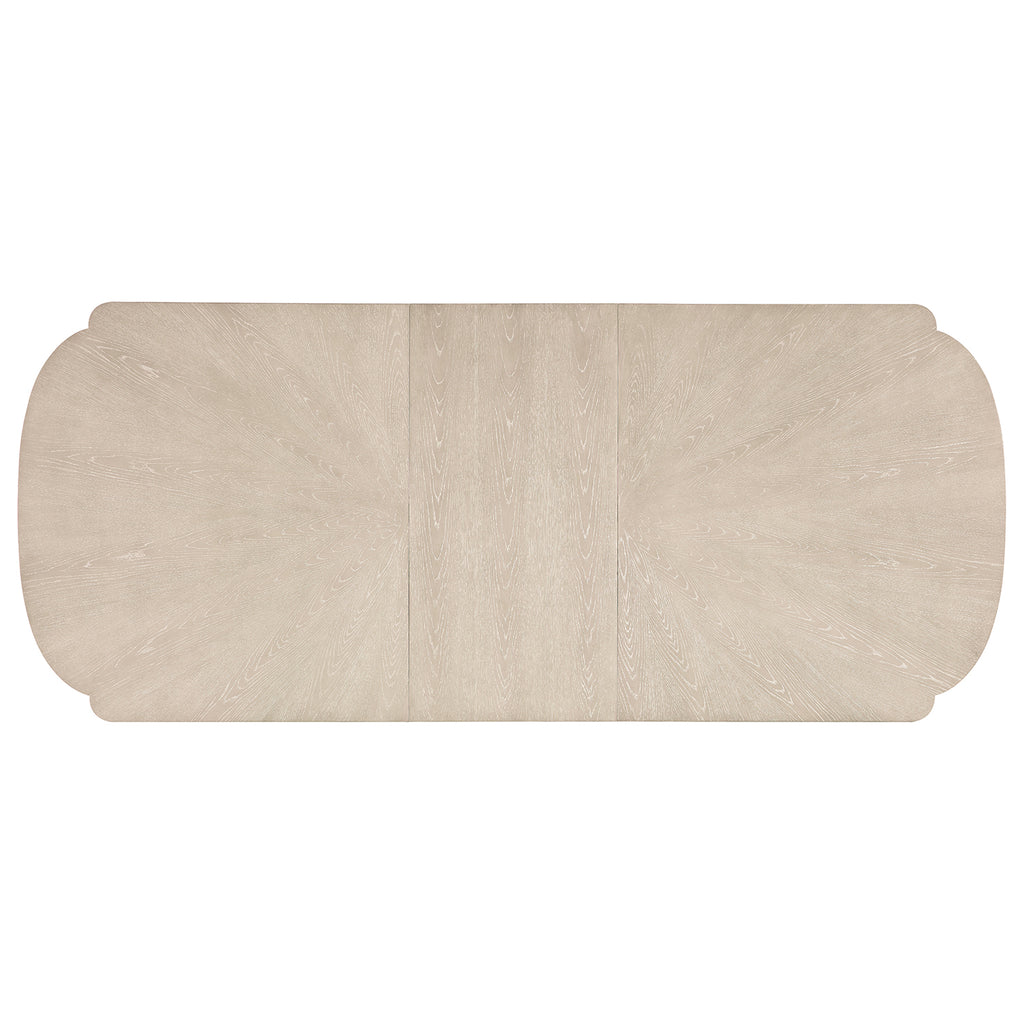 Bring serene style and calm chic to your gatherings with the Nouveau Chic Rectangle Dining Table. Crafted of Quartered and Cathedral Oak Veneers with light wire brushing to create the Sandstone finish, the table has curved, scalloped ends and metal ferrules on the legs, along with a metal accent at the top of the legs.