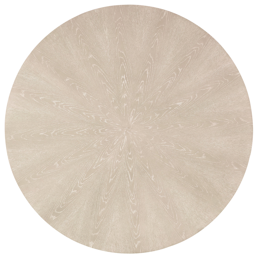 With an hourglass-shaped pedestal base tied in the middle with a metallic-finished collar, the Nouveau Chic Round Dining Table brings serene style to any space. Crafted of Oak Veneers and Resin with a sunburst veneer pattern on top, the table has a Sandstone finish. Accommodates up to 6 coordinating chairs.