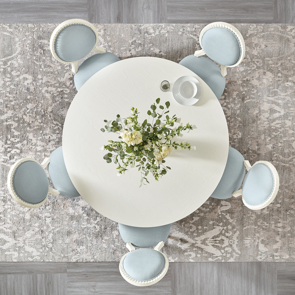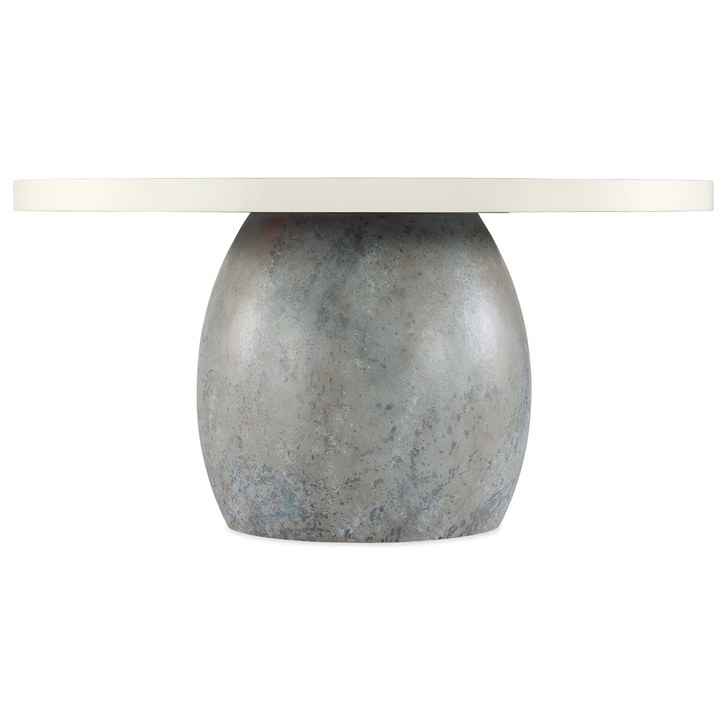 Bring the relaxed aura of the outside in with the Laguna Dining Table, combining a soft, textured white sandblasted finish on the top with a round pedestal base finished in Lagoon, a blue and gray faux stone finish. Crafted of Pine Veneers with a solid wood edge top, the table will accommodate up to 6 coordinating chairs.