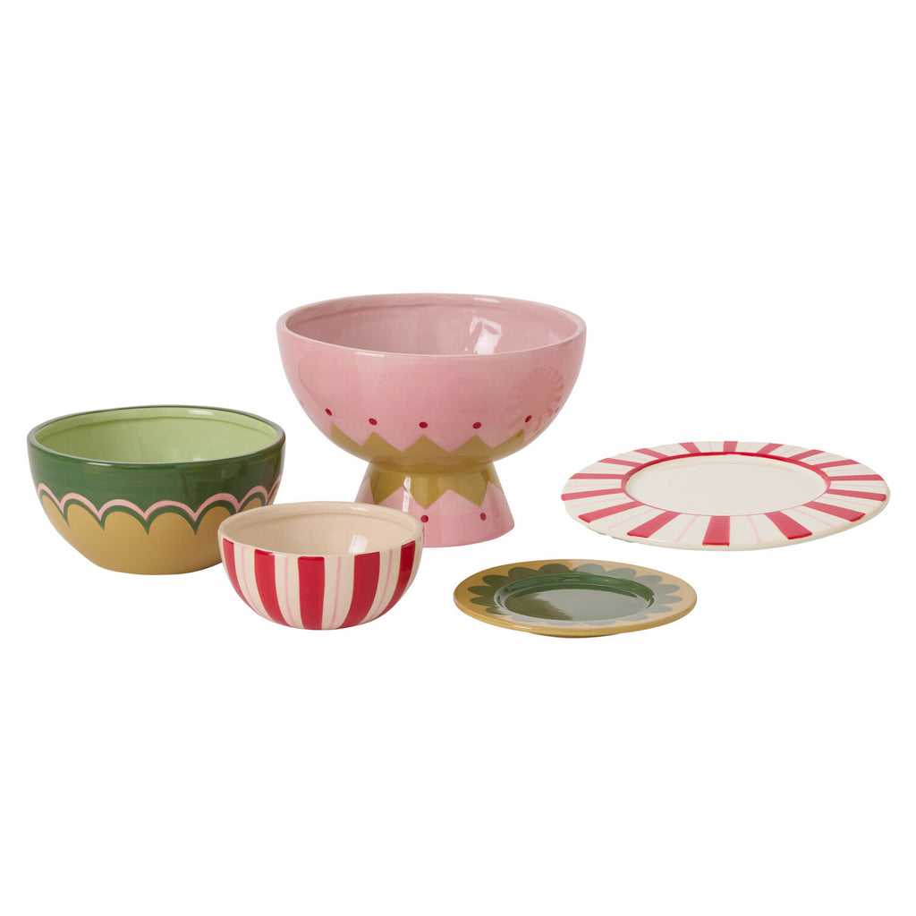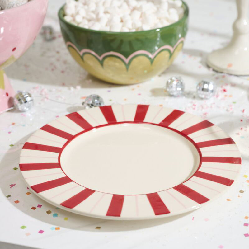 Holiday treats will look irresistible when served on the Deck the Halls Dinner Plate, a food safe circular ceramic plate in a festive red, pink, and white color combination. A playful, hand painted, peppermint striped pattern around the rim of the plate perfectly frames savory and sweet treats. Layer beneath the side plate and alongside the other pieces in the Deck the Halls Collection for a cheery table for the holiday season.