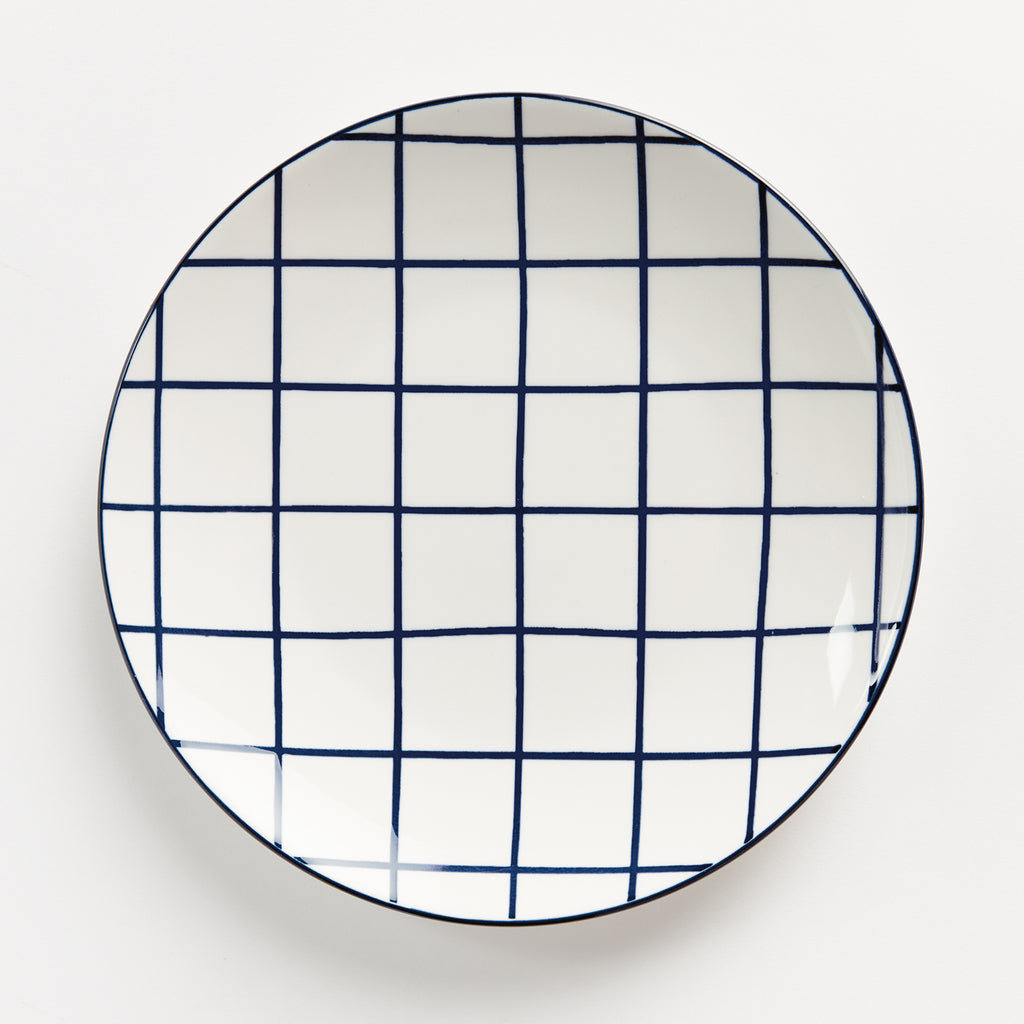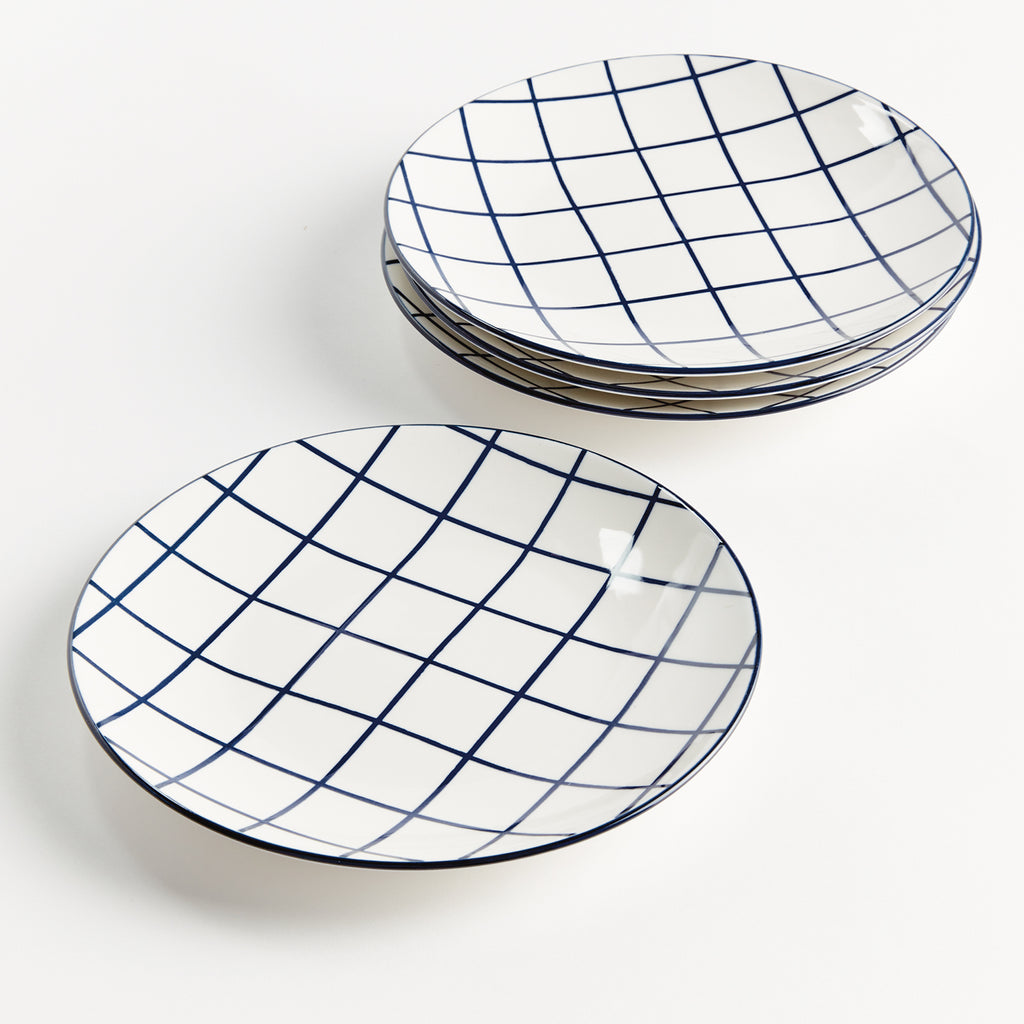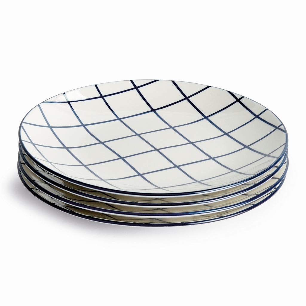 Set the table with a composition in blue. This set of 4 modern stoneware grid design plates is made of dishwasher and microwave safe porcelain. Priced beautifully, too. Feeling blue? Not a chance.