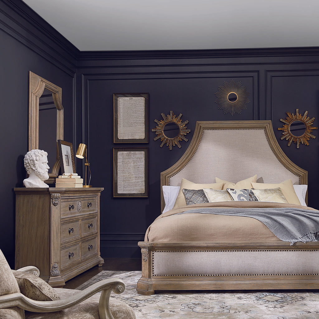 The Arch Salvage Collection from A.R.T. marries the timeless beauty of traditional European architectural detailing with thoughtful functionality for today's living. The six-drawer Grayson Dresser features a broken bellflower medallion on the top two drawers, which are further embellished with a frame of lamb's tongue molding. The angled corner posts have acanthus leaf carvings at top and bottom; the ornate cast metal drawer pulls echo the carved detail. The dresser is constructed of Parawood solids and cathedral elm veneers, and is available in Parch, a light open-grained finish with a worn, sun-bleached look.